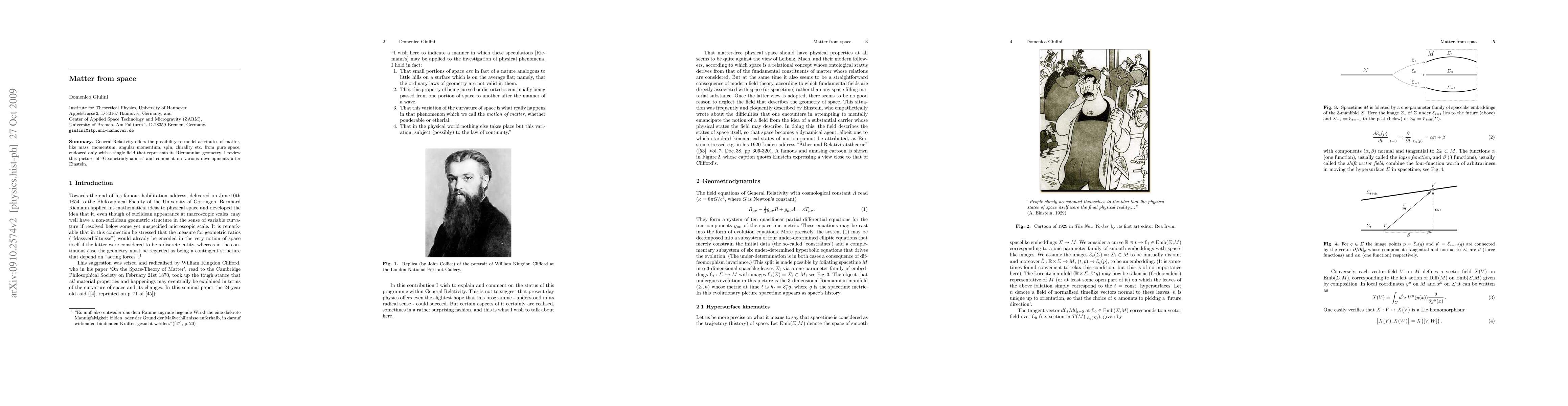 General Relativity offers the possibility to model attributes of matter, like mass, momentum, angular momentum, spin, chirality etc. from pure space, endowed only with a single field that represents its Riemannian geometry. I review this picture of `Geometrodynamics' and comment on various developments after Einstein.