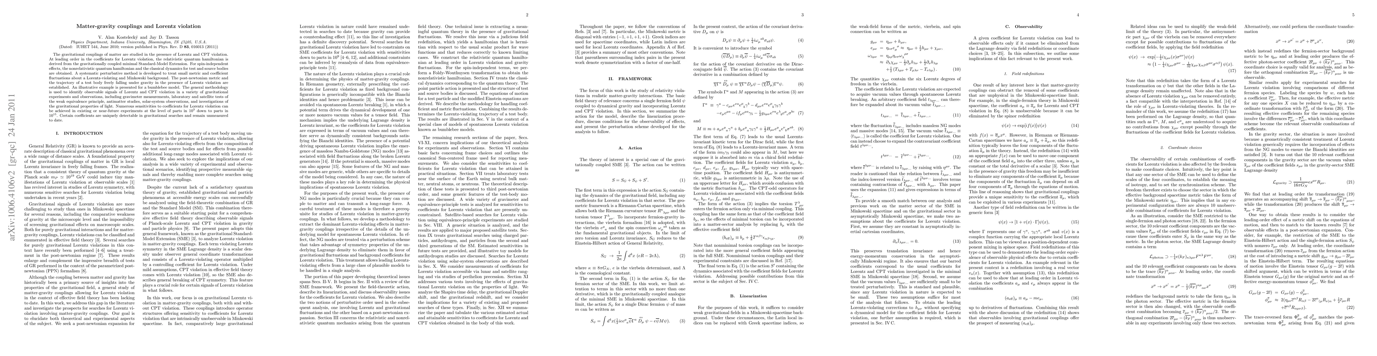 The gravitational couplings of matter are studied in the presence of Lorentz and CPT violation. At leading order in the coefficients for Lorentz violation, the relativistic quantum hamiltonian is derived from the gravitationally coupled minimal Standard-Model Extension. For spin-independent effects, the nonrelativistic quantum hamiltonian and the classical dynamics for test and source bodies are obtained. A systematic perturbative method is developed to treat small metric and coefficient fluctuations about a Lorentz-violating and Minkowski background. The post-newtonian metric and the trajectory of a test body freely falling under gravity in the presence of Lorentz violation are established. An illustrative example is presented for a bumblebee model. The general methodology is used to identify observable signals of Lorentz and CPT violation in a variety of gravitational experiments and observations, including gravimeter measurements, laboratory and satellite tests of the weak equivalence principle, antimatter studies, solar-system observations, and investigations of the gravitational properties of light. Numerous sensitivities to coefficients for Lorentz violation can be achieved in existing or near-future experiments at the level of parts in 10^3 down to parts in 10^{15}. Certain coefficients are uniquely detectable in gravitational searches and remain unmeasured to date.