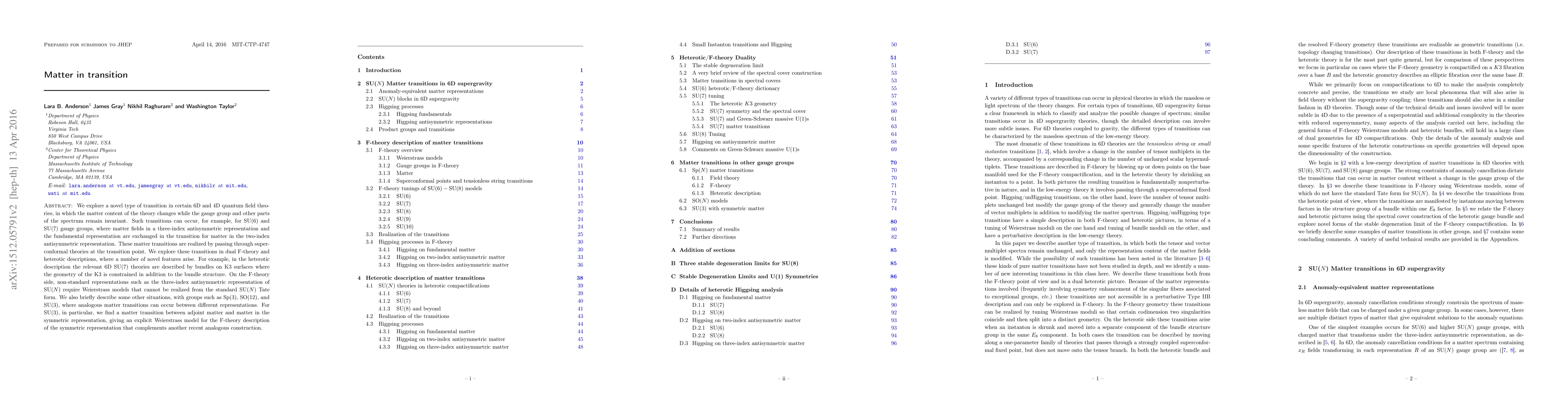 We explore a novel type of transition in certain 6D and 4D quantum field theories, in which the matter content of the theory changes while the gauge group and other parts of the spectrum remain invariant. Such transitions can occur, for example, for SU(6) and SU(7) gauge groups, where matter fields in a three-index antisymmetric representation and the fundamental representation are exchanged in the transition for matter in the two-index antisymmetric representation. These matter transitions are realized by passing through superconformal theories at the transition point. We explore these transitions in dual F-theory and heterotic descriptions, where a number of novel features arise. For example, in the heterotic description the relevant 6D SU(7) theories are described by bundles on K3 surfaces where the geometry of the K3 is constrained in addition to the bundle structure. On the F-theory side, non-standard representations such as the three-index antisymmetric representation of SU(N) require Weierstrass models that cannot be realized from the standard SU(N) Tate form. We also briefly describe some other situations, with groups such as Sp(3), SO(12), and SU(3), where analogous matter transitions can occur between different representations. For SU(3), in particular, we find a matter transition between adjoint matter and matter in the symmetric representation, giving an explicit Weierstrass model for the F-theory description of the symmetric representation that complements another recent analogous construction.