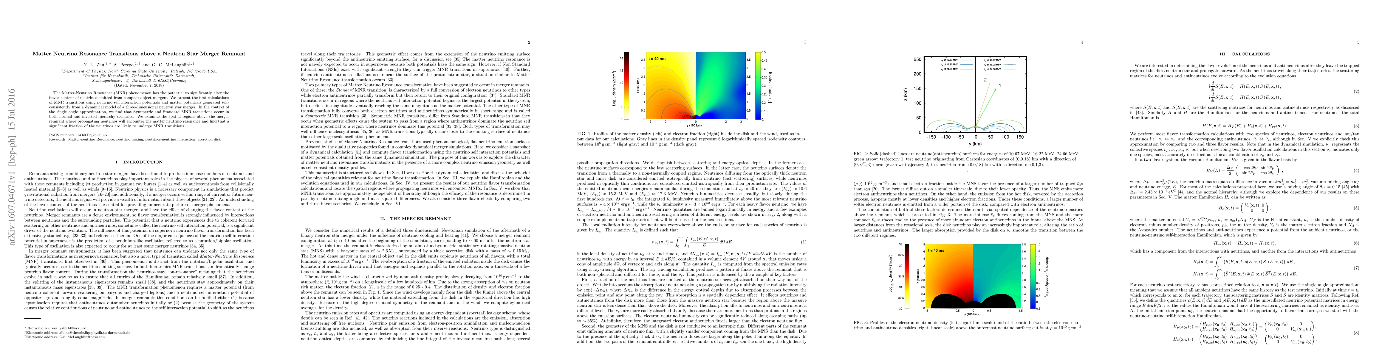 This paper investigates the Matter-Neutrino Resonance (MNR) phenomenon during neutron star mergers, finding that significant neutrino flavor transitions can occur due to self-interaction and matter potentials. It reveals that both symmetric and standard MNR transitions are likely to happen in both normal and inverted hierarchy scenarios, especially in regions above the merger remnant.
