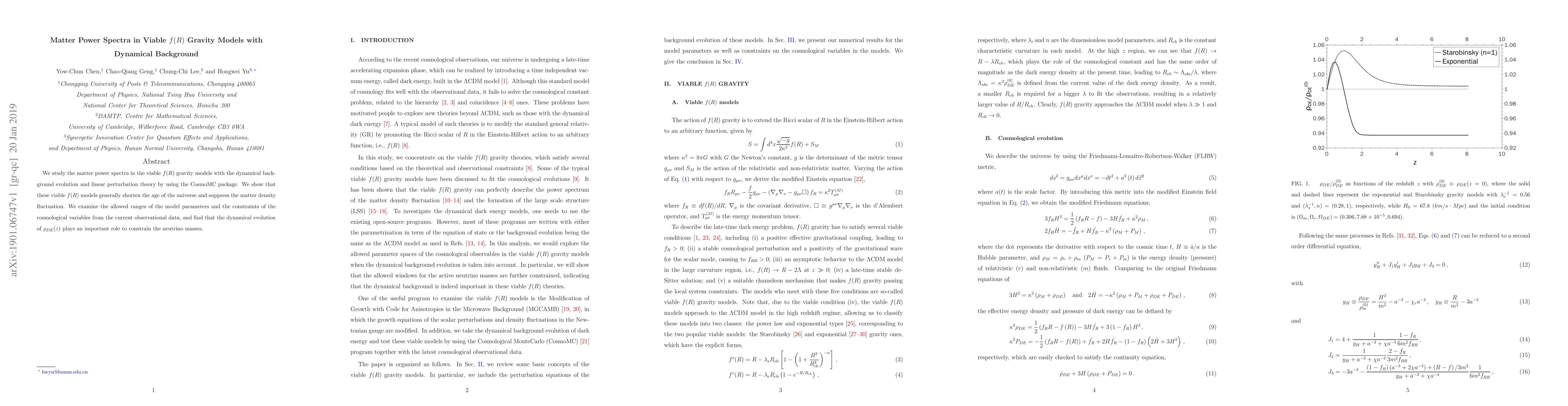 This paper investigates the matter power spectra in viable $f(R)$ gravity models with a dynamical background using linear perturbation theory and CosmoMC. It finds that these models tend to reduce the universe's age and suppress matter density fluctuations, with dynamical dark energy evolution significantly constraining neutrino masses.