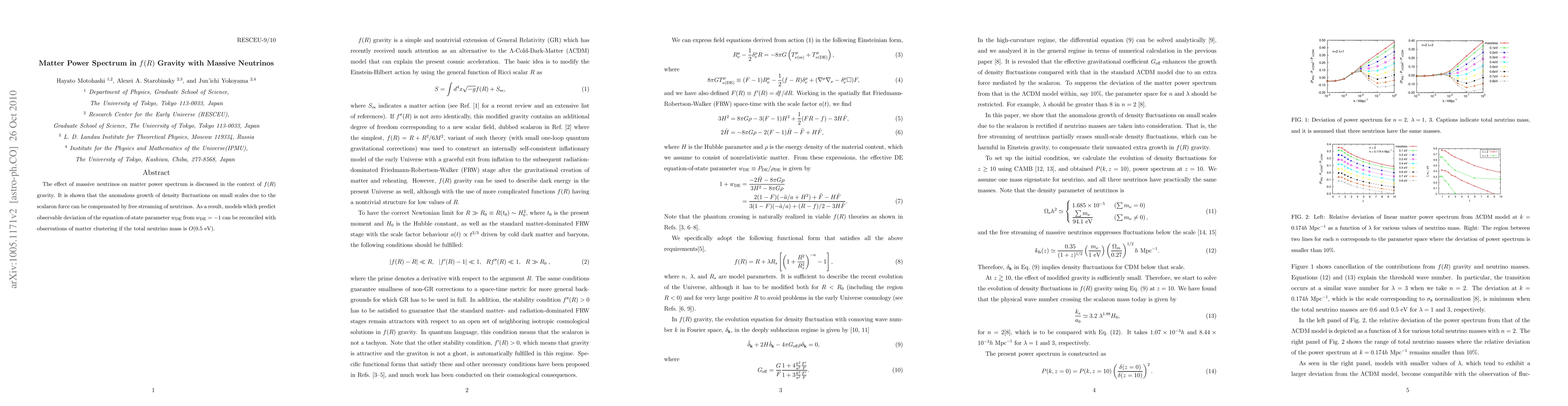 This paper investigates how massive neutrinos influence the matter power spectrum in $f(R)$ gravity, demonstrating that the scalaron force's anomalous density fluctuation growth on small scales can be offset by neutrino free streaming. It concludes that reconciling models predicting deviations in $w_\DE$ from $-1$ with matter clustering observations is feasible if the total neutrino mass is around $0.5 \eV$.