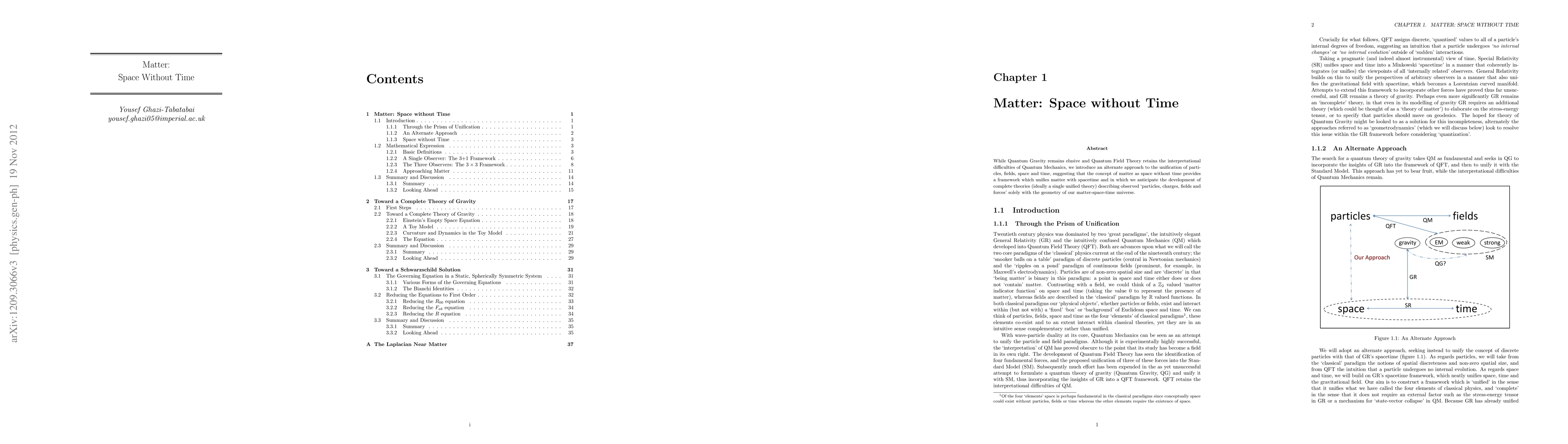 This paper proposes an innovative approach to unifying particles, fields, space, and time, suggesting that matter can be understood as space without time, potentially leading to a complete theory describing all observed phenomena through the geometry of spacetime. This framework aims to overcome the challenges of Quantum Gravity and Quantum Field Theory.