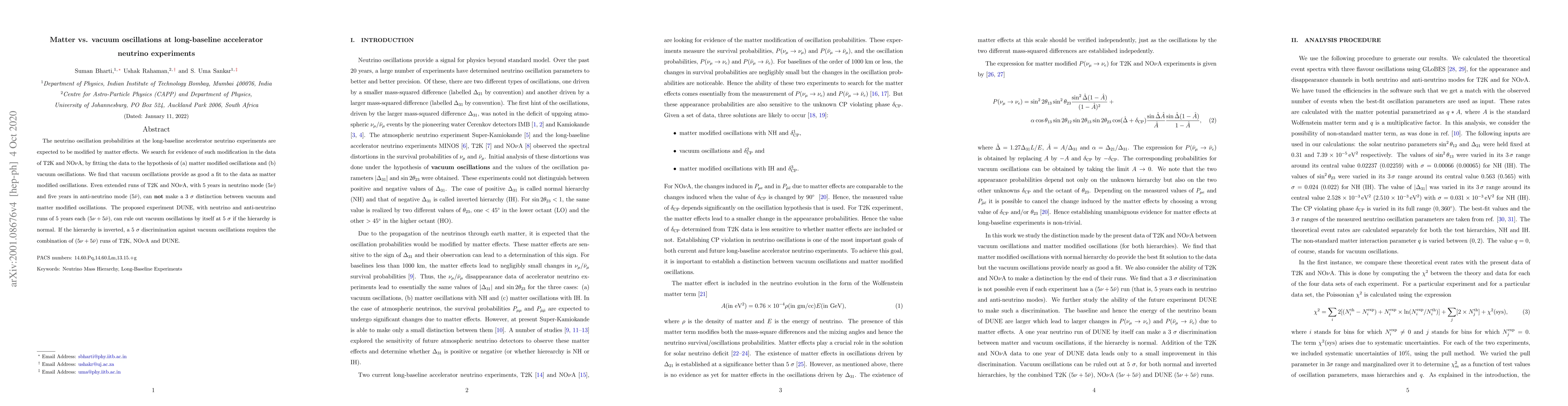 This paper investigates the differences between matter-modified and vacuum neutrino oscillations in long-baseline accelerator experiments like T2K and NO$\nu$A. It finds that current data cannot distinguish between the two, but future DUNE experiments may be able to do so, especially under normal hierarchy conditions.