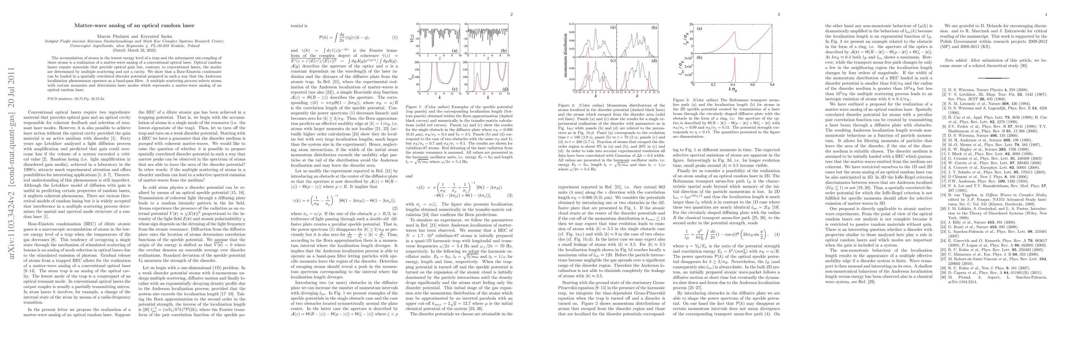 The accumulation of atoms in the lowest energy level of a trap and the subsequent out-coupling of these atoms is a realization of a matter-wave analog of a conventional optical laser. Optical random lasers require materials that provide optical gain but, contrary to conventional lasers, the modes are determined by multiple scattering and not a cavity. We show that a Bose-Einstein condensate can be loaded in a spatially correlated disorder potential prepared in such a way that the Anderson localization phenomenon operates as a band-pass filter. A multiple scattering process selects atoms with certain momenta and determines laser modes which represents a matter-wave analog of an optical random laser.