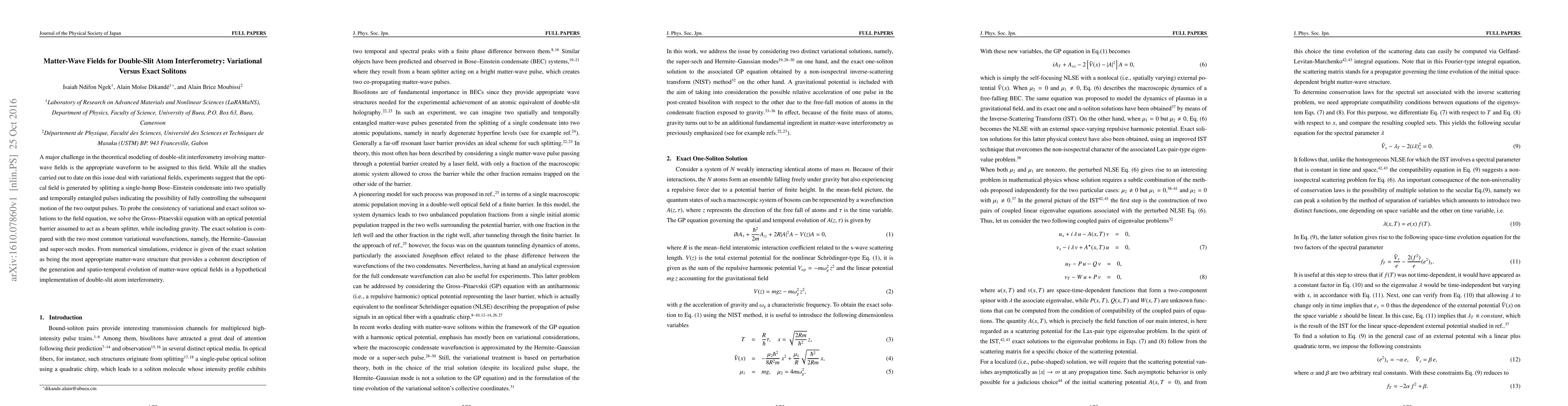 A major challenge in the theoretical modeling of double-slit interferometry involving matter-wave fields is the appropriate waveform to be assigned to this field. While all the studies carried out to date on this issue deal with variational fields, experiments suggest that the optical field is generated by splitting a single-hump Bose-Einstein condensate into two spatially and temporally entangled pulses indicating the possibility of fully controlling the subsequent motion of the two output pulses. To probe the consistency of variational and exact soliton solutions to the field equation, we solve the Gross-Pitaevskii equation with an optical potential barrier assumed to act as a beam splitter, while including gravity. The exact solution is compared with the two most common variational wavefunctions, namely, the Hermite-Gaussian and super-sech modes. From numerical simulations, evidence is given of the exact solution as being the most appropriate matter-wave structure that provides a coherent description of the generation and spatio-temporal evolution of matter-wave optical fields in a hypothetical implementation of double-slit atom interferometry
