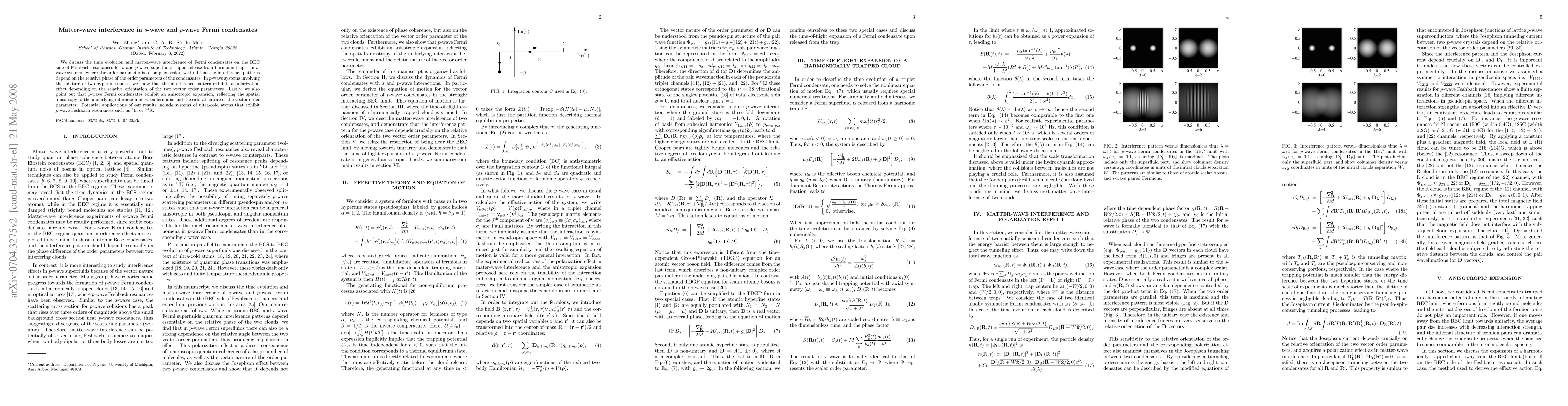 This paper investigates matter-wave interference in s-wave and p-wave Fermi condensates, revealing that interference patterns depend on the relative phase in s-wave systems and exhibit polarization effects in p-wave systems due to the orientation of vector order parameters. It also notes the anisotropic expansion of p-wave condensates.