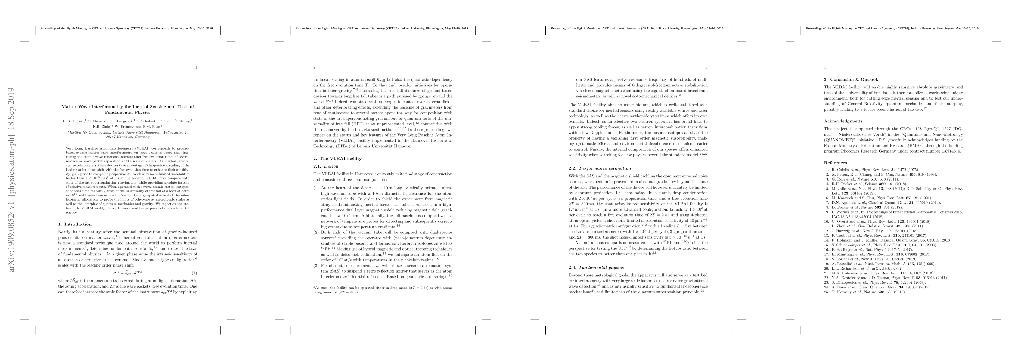 Very Long Baseline Atom Interferometry (VLBAI) corresponds to ground-based atomic matter-wave interferometry on large scales in space and time, letting the atomic wave functions interfere after free evolution times of several seconds or wave packet separation at the scale of meters. As inertial sensors, e.g., accelerometers, these devices take advantage of the quadratic scaling of the leading order phase shift with the free evolution time to enhance their sensitivity, giving rise to compelling experiments. With shot noise-limited instabilities better than $10^{-9}$ m/s$^2$ at 1 s at the horizon, VLBAI may compete with state-of-the-art superconducting gravimeters, while providing absolute instead of relative measurements. When operated with several atomic states, isotopes, or species simultaneously, tests of the universality of free fall at a level of parts in $10^{13}$ and beyond are in reach. Finally, the large spatial extent of the interferometer allows one to probe the limits of coherence at macroscopic scales as well as the interplay of quantum mechanics and gravity. We report on the status of the VLBAI facility, its key features, and future prospects in fundamental science.