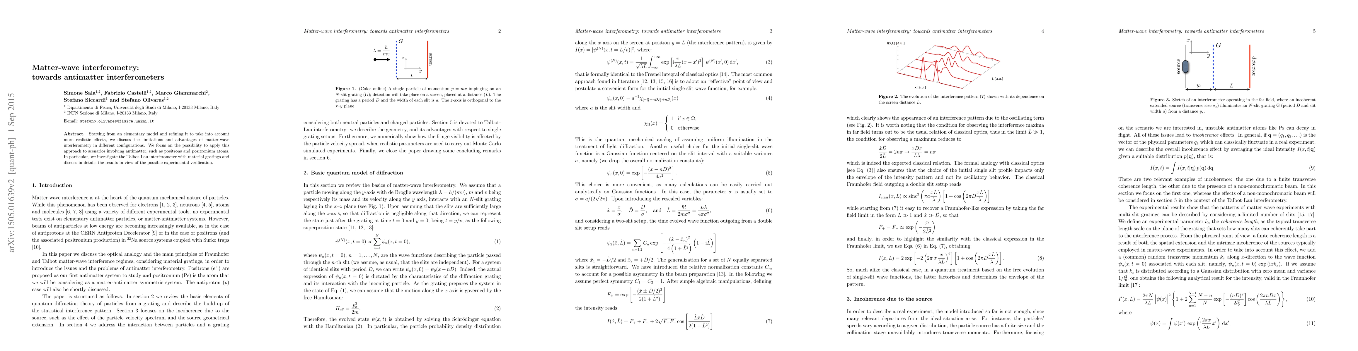 Starting from an elementary model and refining it to take into account more realistic effects, we discuss the limitations and advantages of matter-wave interferometry in different configurations. We focus on the possibility to apply this approach to scenarios involving antimatter, such as positrons and positronium atoms. In particular, we investigate the Talbot-Lau interferometer with material gratings and discuss in details the results in view of the possible experimental verification.