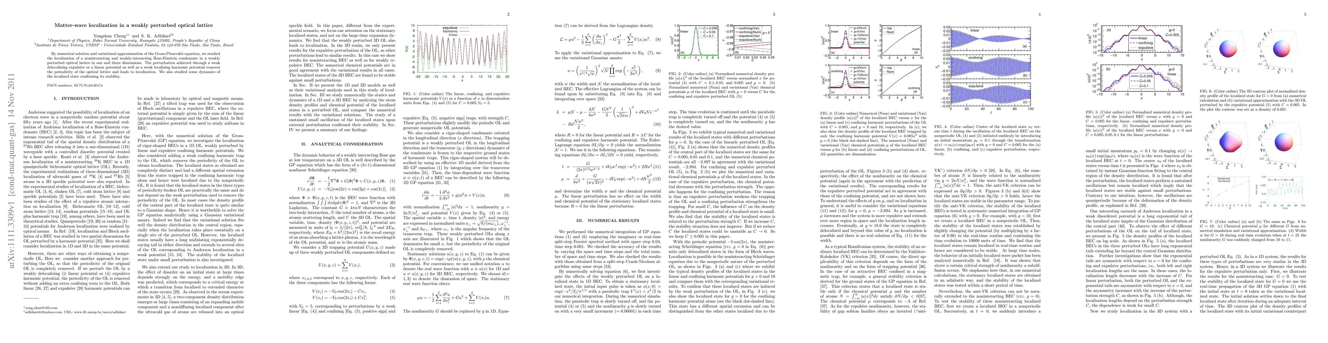 By numerical solution and variational approximation of the Gross-Pitaevskii equation, we studied the localization of a noninteracting and weakly-interacting Bose-Einstein condensate in a weakly perturbed optical lattice in one and three dimensions. The perturbation achieved through a weak delocalizing expulsive or a linear potential as well as a weak localizing harmonic potential removes the periodicity of the optical lattice and leads to localization. We also studied some dynamics of the localized state confirming its stability.