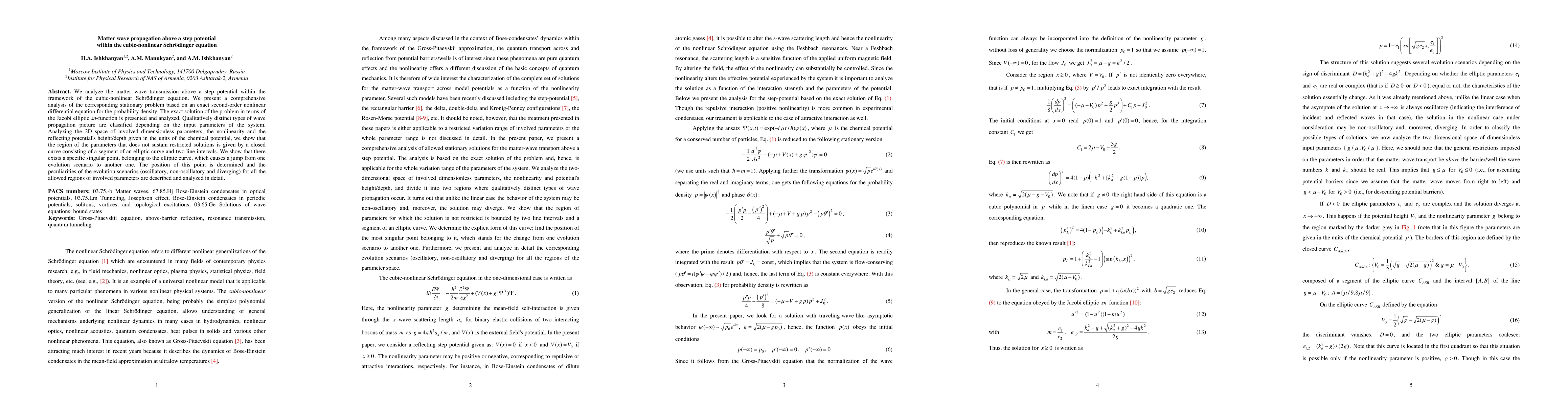 We analyze the matter wave transmission above a step potential within the framework of the cubic-nonlinear Schr\"odinger equation. We present a comprehensive analysis of the corresponding stationary problem based on an exact second-order nonlinear differential equation for the probability density. The exact solution of the problem in terms of the Jacobi elliptic sn-function is presented and analyzed. Qualitatively distinct types of wave propagation picture are classified depending on the input parameters of the system. Analyzing the 2D space of involved dimensionless parameters, the nonlinearity and the reflecting potential's height/depth given in the units of the chemical potential, we show that the region of the parameters that does not sustain restricted solutions is given by a closed curve consisting of a segment of an elliptic curve and two line intervals. We show that there exists a specific singular point, belonging to the elliptic curve, which causes a jump from one evolution scenario to another one. The position of this point is determined and the peculiarities of the evolution scenarios (oscillatory, non-oscillatory and diverging) for all the allowed regions of involved parameters are described and analyzed in detail.