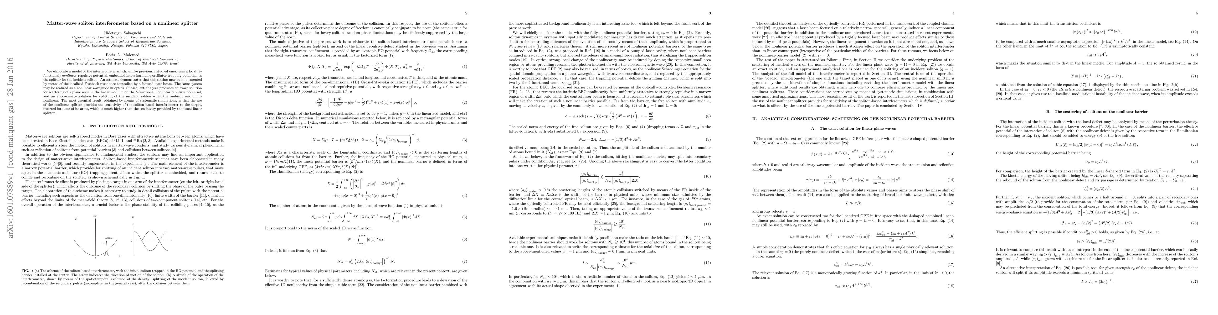This paper proposes a novel matter-wave soliton interferometer using a delta-functional nonlinear splitter, demonstrating higher sensitivity than traditional linear interferometers. The splitter is implemented via localized Feshbach resonance, and simulations show enhanced sensitivity to targets in one arm.