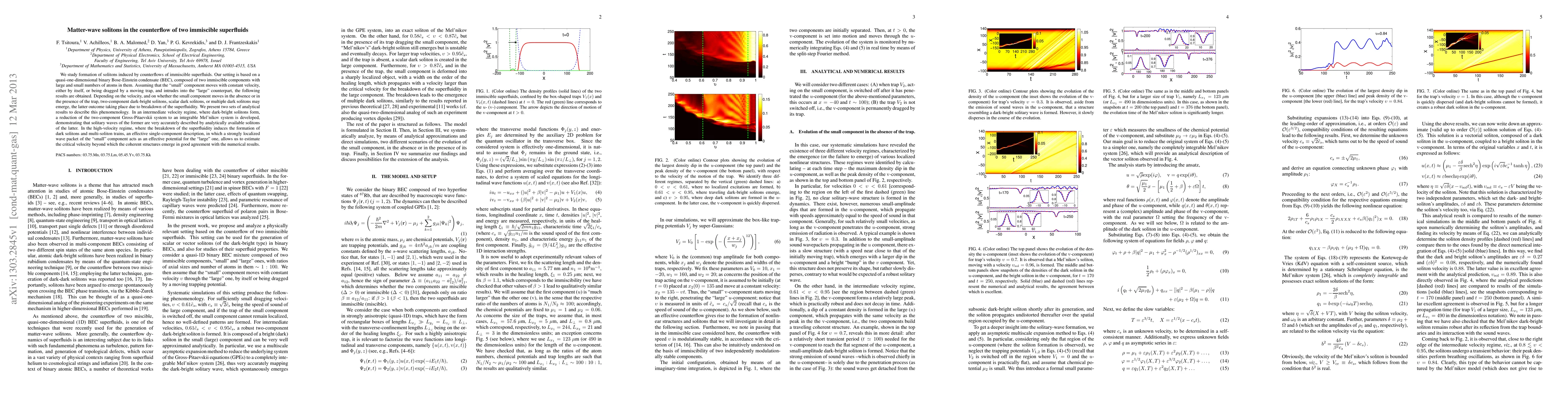 We study formation of solitons induced by counterflows of immiscible superfluids. Our setting is based on a quasi-one-dimensional binary Bose-Einstein condensate (BEC), composed of two immiscible components with large and small numbers of atoms in them. Assuming that the "small" component moves with constant velocity, either by itself, or being dragged by a moving trap, and intrudes into the "large" counterpart, the following results are obtained. Depending on the velocity, and on whether the small component moves in the absence or in the presence of the trap, two-component dark-bright solitons, scalar dark solitons, or multiple dark solitons may emerge, the latter outcome taking place due to breakdown of the superfluidity. We present two sets of analytical results to describe this phenomenology. In an intermediate velocity regime, where dark-bright solitons form, a reduction of the two-component Gross-Pitaevskii system to an integrable Mel'nikov system is developed, demonstrating that solitary waves of the former are very accurately described by analytically available solitons of the latter. In the high-velocity regime, where the breakdown of the superfluidity induces the formation of dark solitons and multi-soliton trains, an effective single-component description, in which a strongly localized wave packet of the "small" component acts as an effective potential for the "large" one, allows us to estimate the critical velocity beyond which the coherent structures emerge in good agreement with the numerical results.