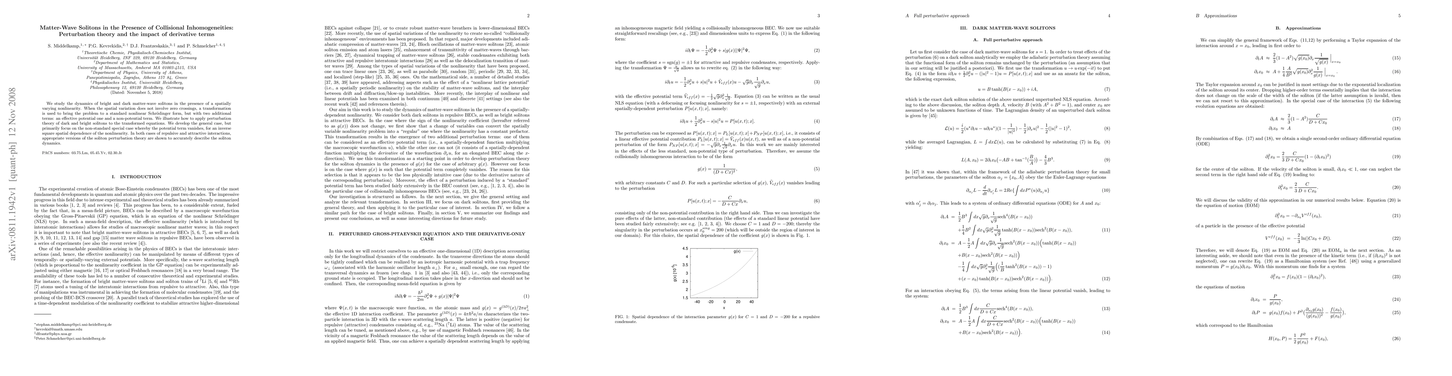 We study the dynamics of bright and dark matter-wave solitons in the presence of a spatially varying nonlinearity. When the spatial variation does not involve zero crossings, a transformation is used to bring the problem to a standard nonlinear Schrodinger form, but with two additional terms: an effective potential one and a non-potential term. We illustrate how to apply perturbation theory of dark and bright solitons to the transformed equations. We develop the general case, but primarily focus on the non-standard special case whereby the potential term vanishes, for an inverse square spatial dependence of the nonlinearity. In both cases of repulsive and attractive interactions, appropriate versions of the soliton perturbation theory are shown to accurately describe the soliton dynamics.