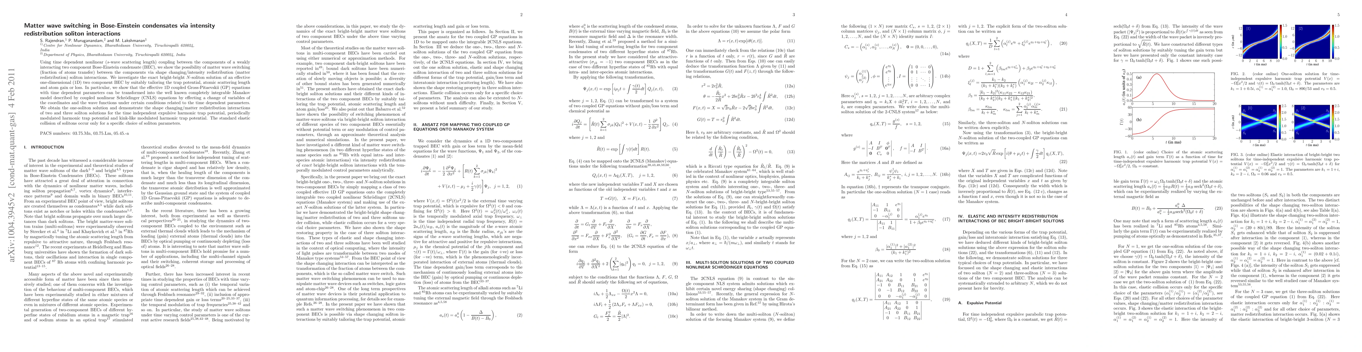 This paper demonstrates matter wave switching in Bose-Einstein condensates through soliton interactions, showing atom transfer between components via intensity redistribution. It derives bright-bright N-soliton solutions for effective one-dimensional two-component BECs, transforming coupled Gross-Pitaevskii equations into integrable Manakov model equations.