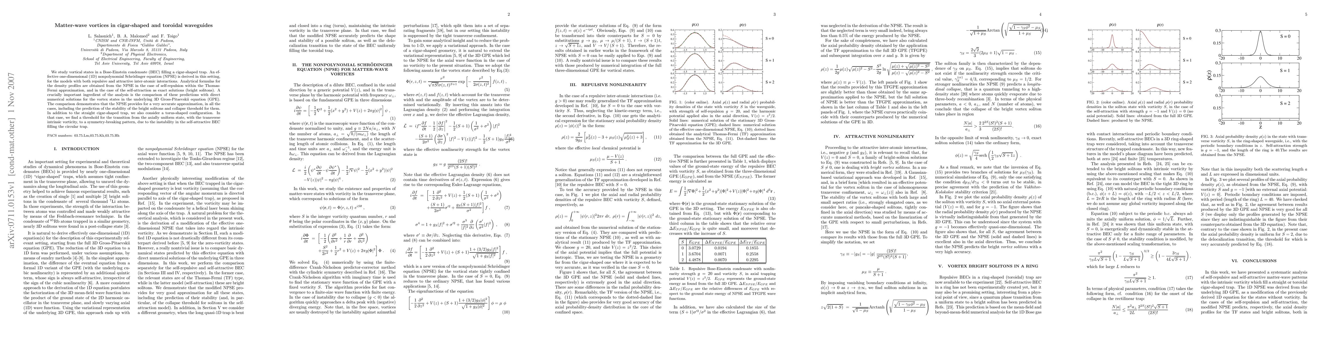 We study vortical states in a Bose-Einstein condensate (BEC) filling a cigar-shaped trap. An effective one-dimensional (1D) nonpolynomial Schroedinger equation (NPSE) is derived in this setting, for the models with both repulsive and attractive inter-atomic interactions. Analytical formulas for the density profiles are obtained from the NPSE in the case of self-repulsion within the Thomas-Fermi approximation, and in the case of the self-attraction as exact solutions (bright solitons). A crucially important ingredient of the analysis is the comparison of these predictions with direct numerical solutions for the vortex states in the underlying 3D Gross-Pitaevskii equation (GPE). The comparison demonstrates that the NPSE provides for a very accurate approximation, in all the cases, including the prediction of the stability of the bright solitons and collapse threshold for them. In addition to the straight cigar-shaped trap, we also consider a torus-shaped configuration. In that case, we find a threshold for the transition from the axially uniform state, with the transverse intrinsic vorticity, to a symmetry-breaking pattern, due to the instability in the self-attractive BEC filling the circular trap.