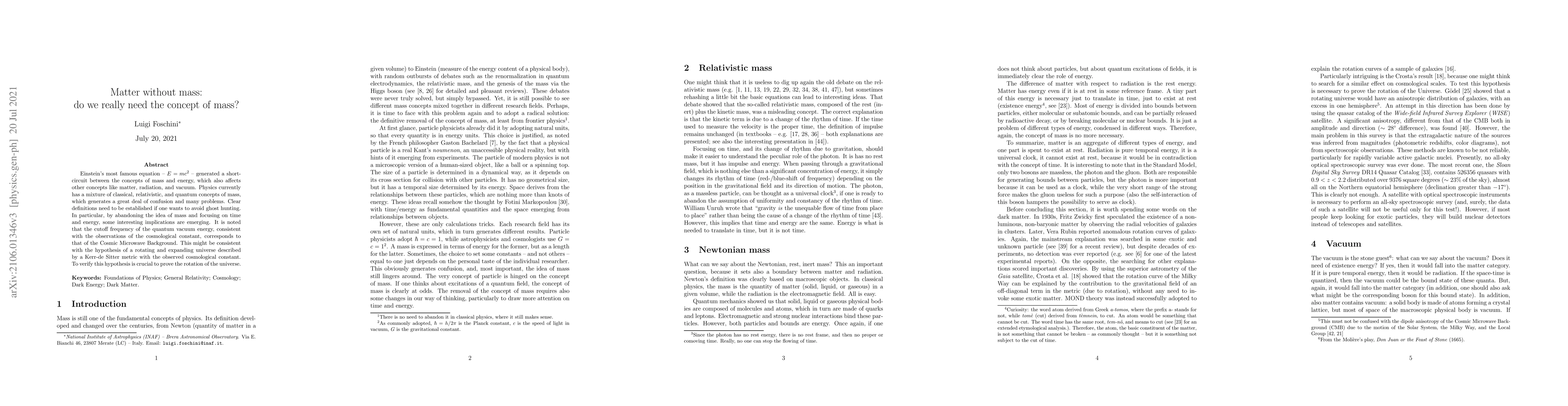 Einstein's most famous equation -- $E=mc^2$ -- generated a short-circuit between the concepts of mass and energy, which also affects other concepts like matter, radiation, and vacuum. Physics currently has a mixture of classical, relativistic, and quantum concepts of mass, which generates a great deal of confusion and many problems. Clear definitions need to be established if one wants to avoid ghost hunting. In particular, by abandoning the idea of mass and focusing on time and energy, some interesting implications are emerging. It is noted that the cutoff frequency of the quantum vacuum energy, consistent with the observations of the cosmological constant, corresponds to that of the Cosmic Microwave Background. This might be consistent with the hypothesis of a rotating and expanding universe described by a Kerr-de Sitter metric with the observed cosmological constant. To verify this hypothesis is crucial to prove the rotation of the universe.