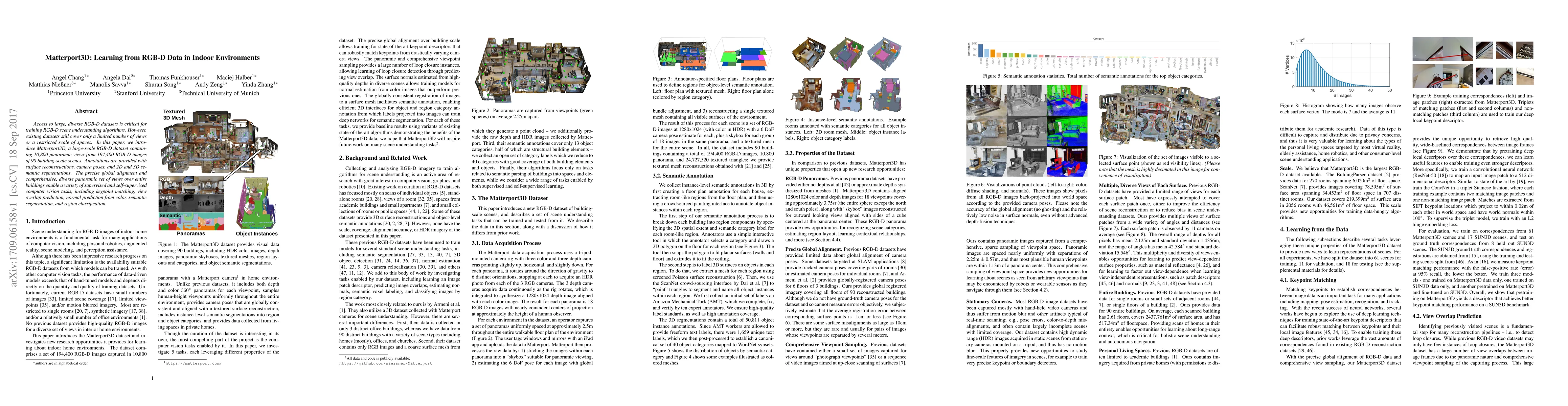 Access to large, diverse RGB-D datasets is critical for training RGB-D scene understanding algorithms. However, existing datasets still cover only a limited number of views or a restricted scale of spaces. In this paper, we introduce Matterport3D, a large-scale RGB-D dataset containing 10,800 panoramic views from 194,400 RGB-D images of 90 building-scale scenes. Annotations are provided with surface reconstructions, camera poses, and 2D and 3D semantic segmentations. The precise global alignment and comprehensive, diverse panoramic set of views over entire buildings enable a variety of supervised and self-supervised computer vision tasks, including keypoint matching, view overlap prediction, normal prediction from color, semantic segmentation, and region classification.