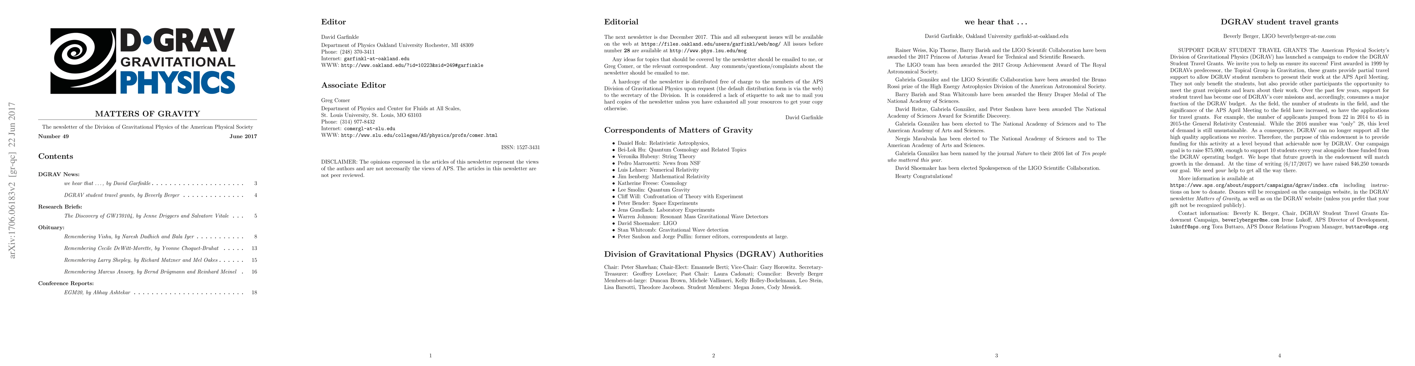 DGRAV News: We hear that .... DGRAV student travel grants Research Briefs: The Discovery of GW170104 Obituary: Remembering Vishu Remembering Cecile DeWitt-Morette Remembering Larry Shepley Remembering Marcus Ansorg Conference Reports: EGM20