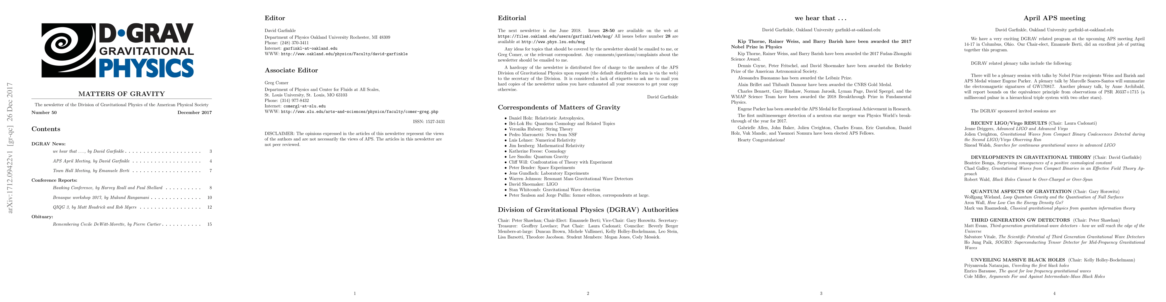 DGRAV News: We hear that .... APS April Meeting Town Hall Meeting Conference Reports: Hawking Conference Benasque workshop 2017 QIQG 3 Obituary: Remembering Cecile De Witt-Morette