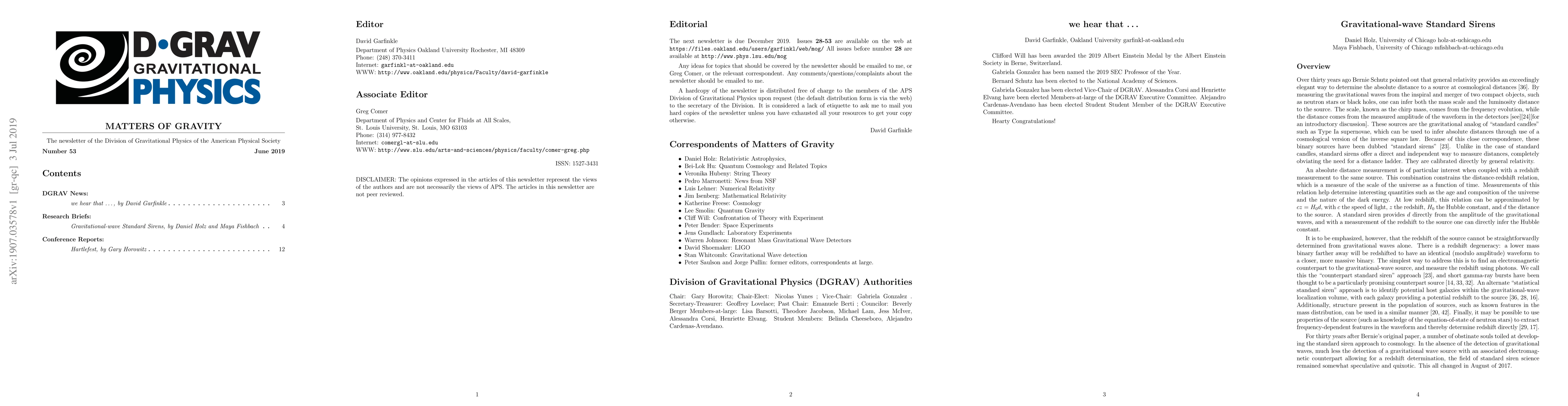 we hear that..., by David Garfinkle Gravitational-wave Standard Sirens, by Daniel Holz and Maya Fishbach HartleFest, by Gary Horowitz