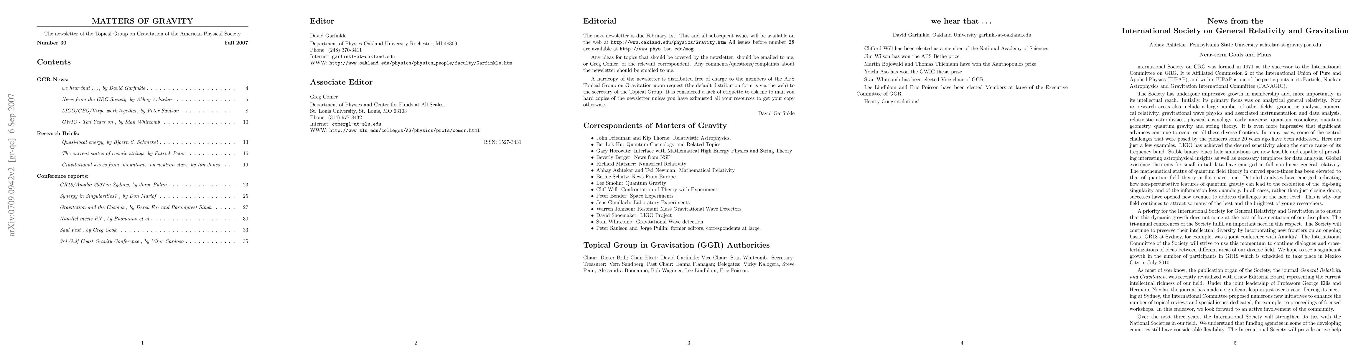 GGR News: -we hear that..., by David Garfinkle -News from the GRG Society, by Abhay Ashtekar -LIGO/GEO/Virgo work together, by Peter Saulson -GWIC Ten Years on, by Stan Whitcomb Research Briefs: -Quasi-local energy, by Bjoern S. Schmekel -The current status of cosmic strings, by Patrick Peter -Gravitational waves from `mountains' on neutron stars, by Ian Jones Conference reports: -GR18/Amaldi 2007 in Sydney, by Jorge Pullin -Synergy in Singularities? by Don Marolf -Gravitation and the Cosmos, by Derek Fox and Parampreet Singh -NumRel meets PN, by Buonanno et al -SaulFest, by Greg Cook -3rd Gulf Coast Gravity Conference, by Vitor Cardoso