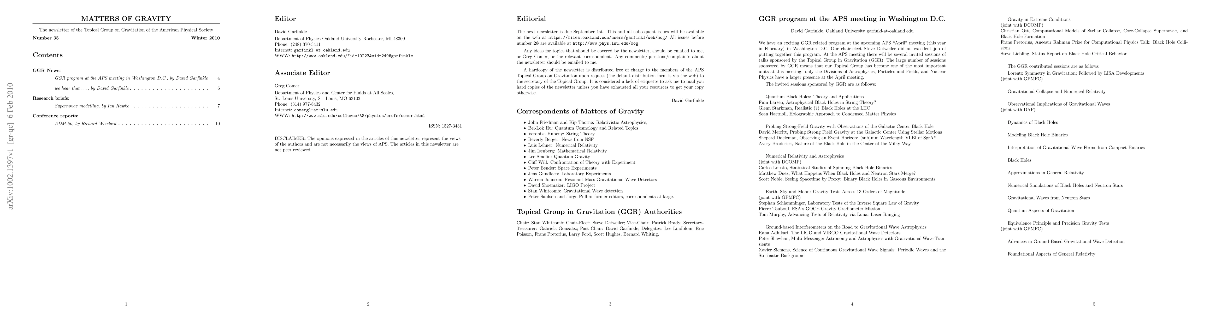 GGR News: - GGR Program at the APS meeting in Washington D.C., by David Garfinkle - we hear that..., by David Garfinkle Research Briefs: - Supernovae modelling, by Ian Hawke Conference Reports: - ADM-50, by Richard Woodard