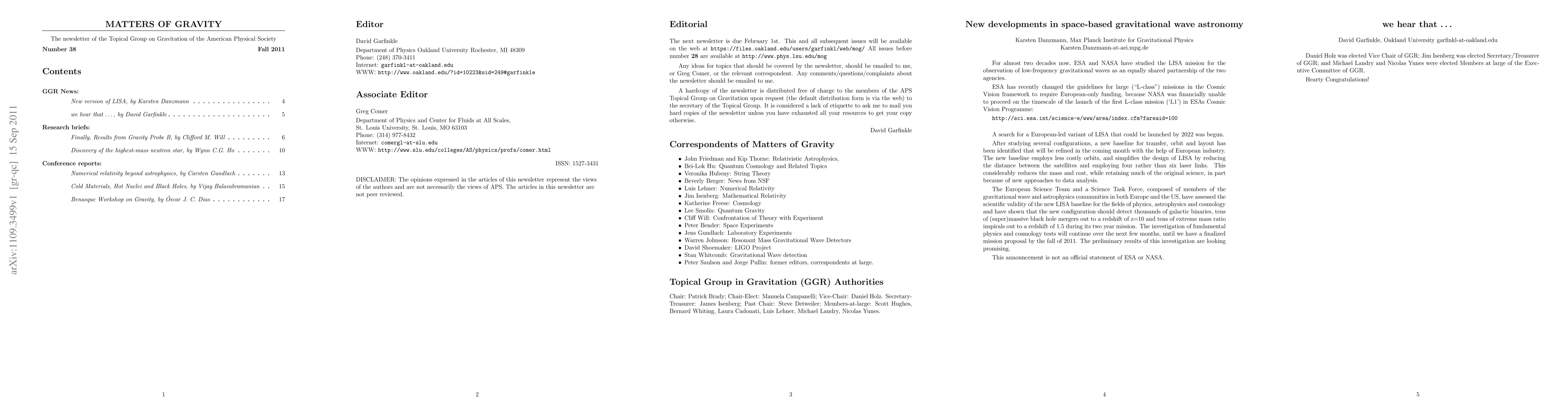 GGR News: New version of LISA, by Karsten Danzmann We hear that, by David Garfinkle Research Briefs: Finally, results from Gravity Probe B, by Clifford M. Will Discovery of the highest mass neutron star, by Wynn C.G. Ho Conference reports: Numerical relativity beyond astrophysics, by Carsten Gundlac Cold materials, hot nuclei and black holes, by Vijay Balasubramanian Benasque workshop on gravity, by Oscar J.C. Dias