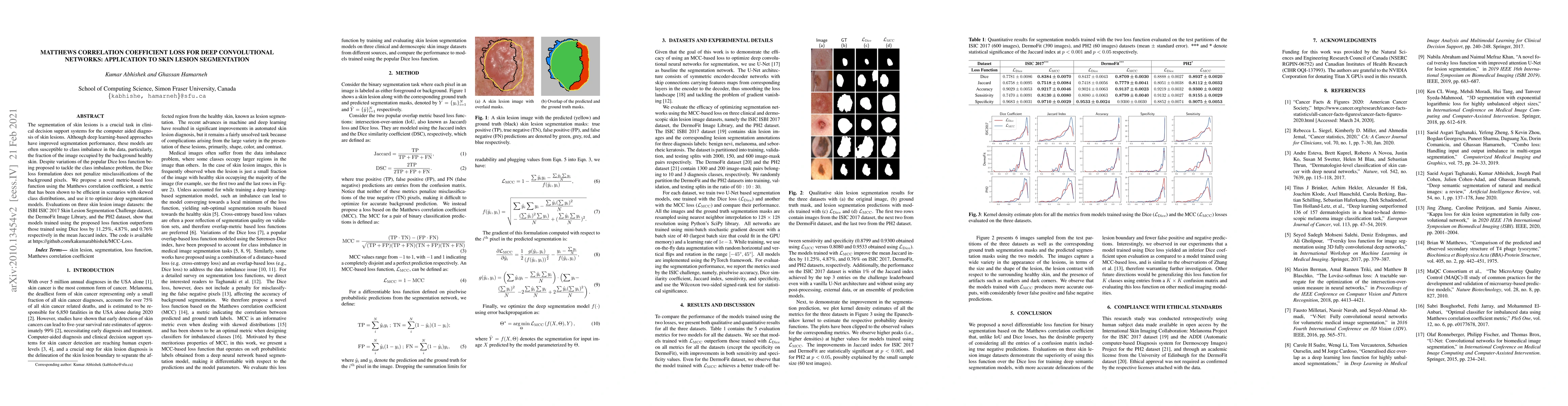 This paper proposes a Matthews Correlation Coefficient (MCC) loss function to improve skin lesion segmentation in deep convolutional networks, addressing class imbalance issues. Models trained with MCC loss outperform those using Dice loss on three datasets, showing significant improvements in mean Jaccard index.