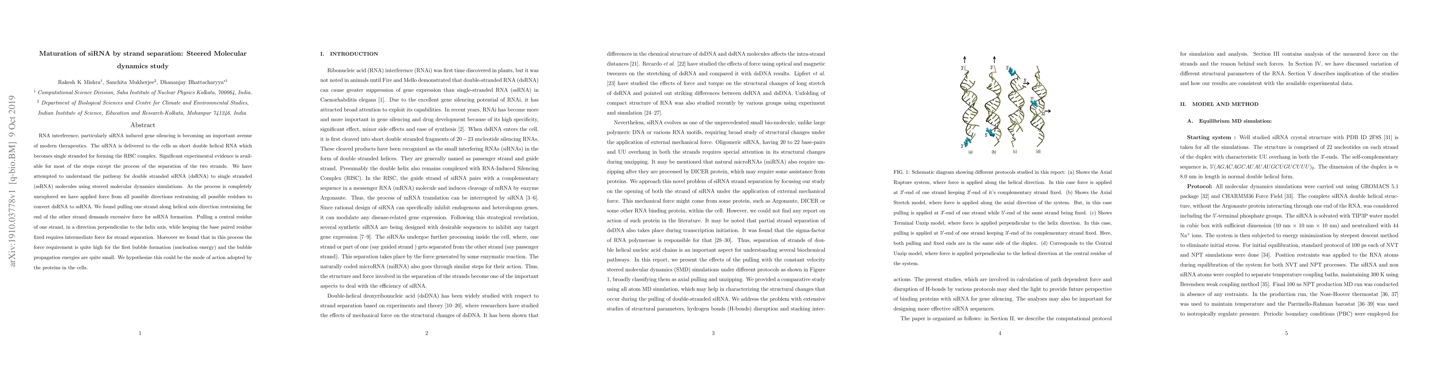 Researchers used molecular dynamics simulations to study how double-stranded siRNA separates into single strands, finding that pulling one strand along the helical axis requires high force, while a central residue pulled perpendicularly has intermediate force requirements. The findings suggest proteins in cells may adopt this mechanism for gene silencing.