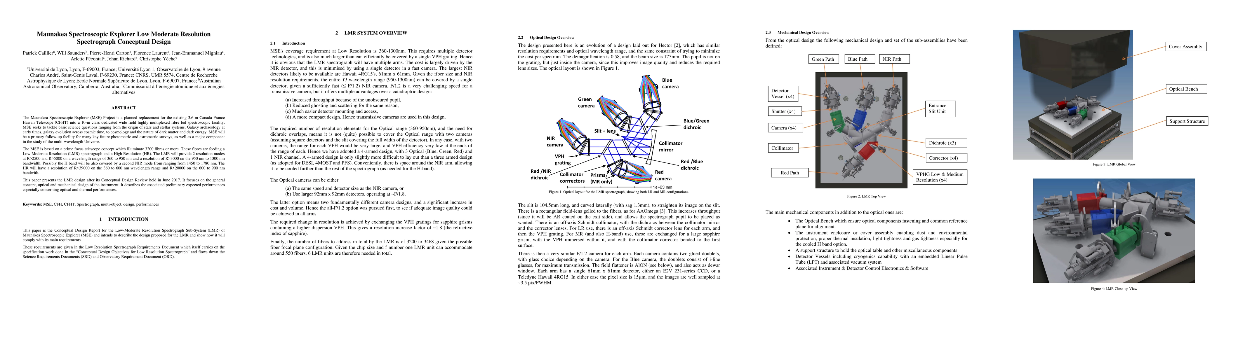 The Maunakea Spectroscopic Explorer (MSE) Project aims to replace the CFHT with a 10-m class telescope featuring a Low Moderate Resolution (LMR) spectrograph. The LMR spectrograph will provide resolutions of R>2500 and R>5000 across a 360-950 nm range, and R>3000 in the 950-1300 nm bandwidth, supporting scientific studies on stellar origins, galaxy evolution, and cosmology.