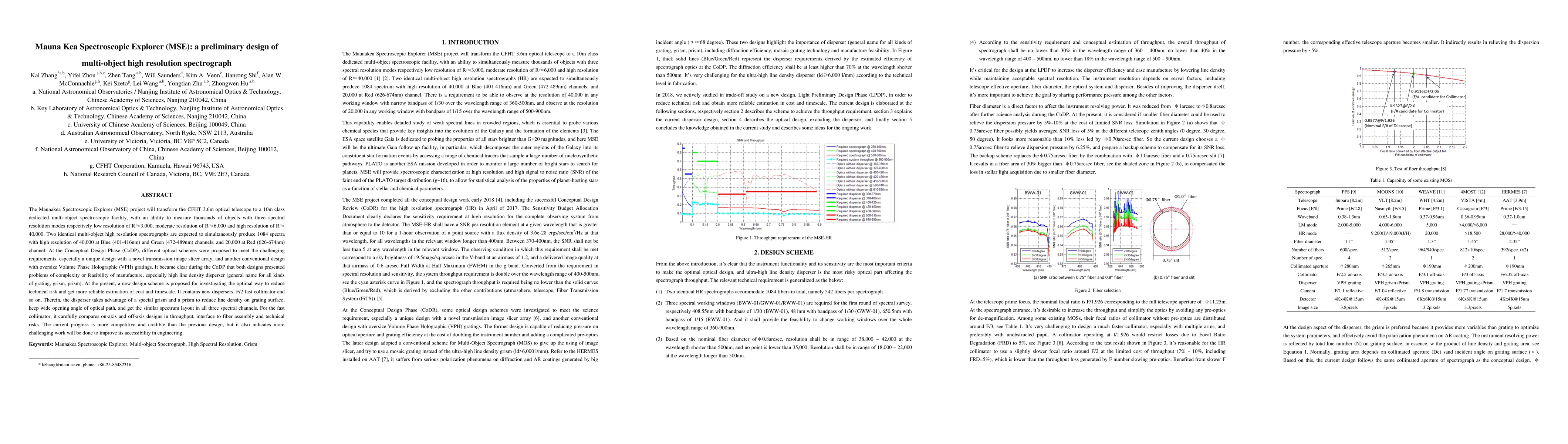 The Maunakea Spectroscopic Explorer (MSE) aims to upgrade the CFHT telescope into a 10m multi-object spectrograph capable of high-resolution spectra. The proposed design includes new dispersers and a fast collimator to address previous technical challenges, though further engineering improvements are still needed.