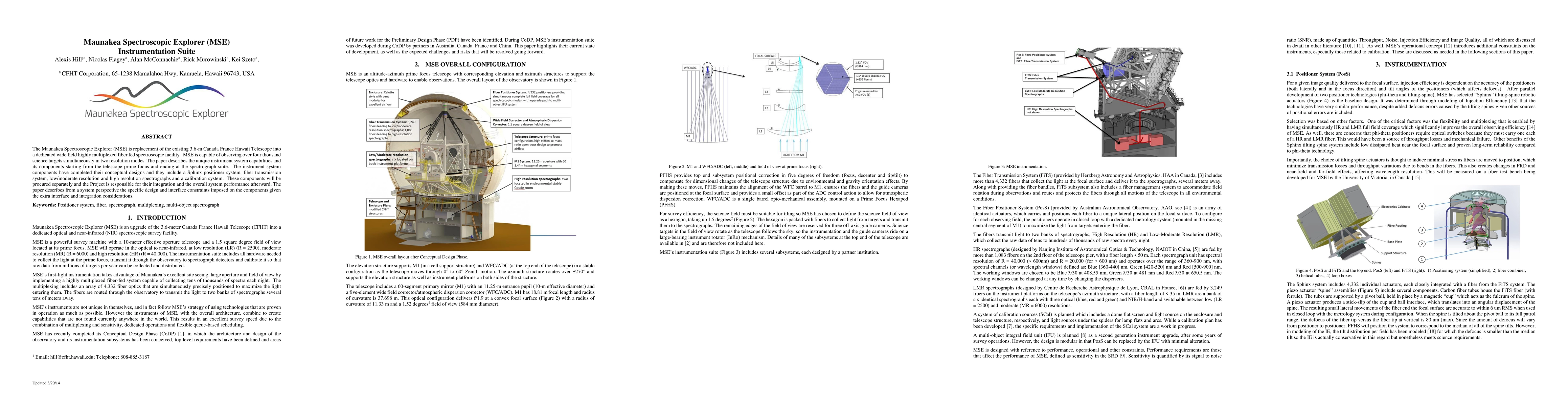 The Maunakea Spectroscopic Explorer (MSE) replaces the Canada France Hawaii Telescope, enabling simultaneous observation of 4,000 targets via a wide-field, multiplexed fiber-fed spectroscopic system. The paper details the conceptual design of its components, including a Sphinx positioner, fiber transmission, and various spectrographs, emphasizing integration and performance constraints.