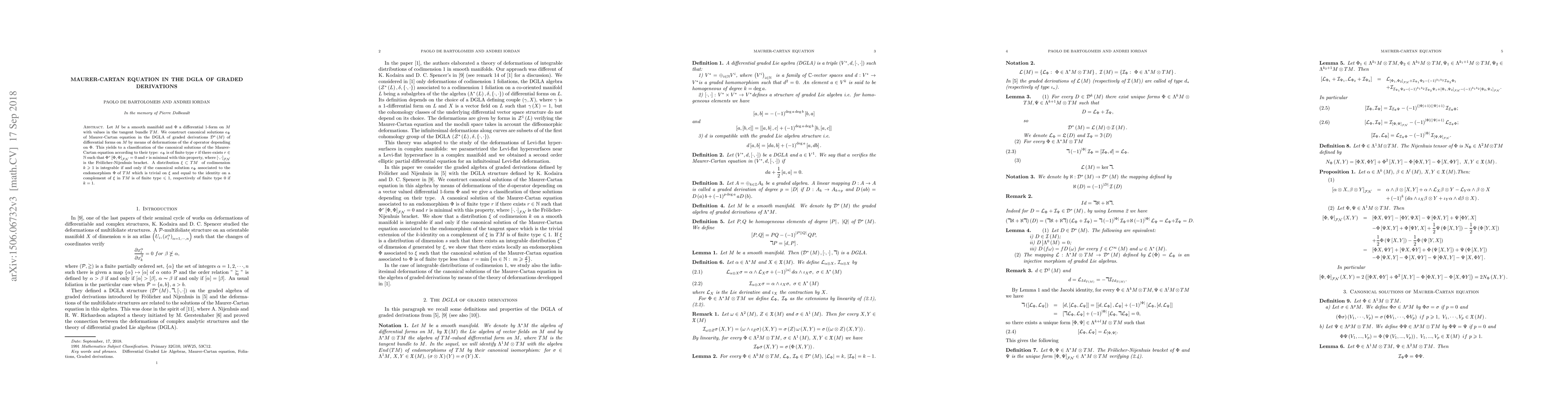 Let M be a smooth manifold and $\Phi$ a differential 1-form on M with values in the tangent bundle TM. We construct canonical solutions $e_\Phi$ of Maurer-Cartan equation in the DGLA of graded derivations D*(M) of differential forms on M by means of deformations of d depending on $\Phi$. This yields to a classification of the canonical solutions of the Maurer-Cartan equation according to their type: $e_\Phi$ is of finite type r if there exists $r\in N$ such that $\Phi^r[\Phi,\Phi]_{FN} = 0$ and r is minimal with this property, where $[.,.]_{FN}$ is the Fr\"olicher-Nijenhuis bracket. A distribution $\xi\subset TM$ of codimension k > 1 is integrable if and only if the canonical solution $e_\Phi$ associated to the endomorphism $\Phi$ of TM which is trivial on $\xi$ and equal to the identity on a complement of $\xi$ in TM is of finite type $\leq 1$, respectively of finite type 0 if k = 1.