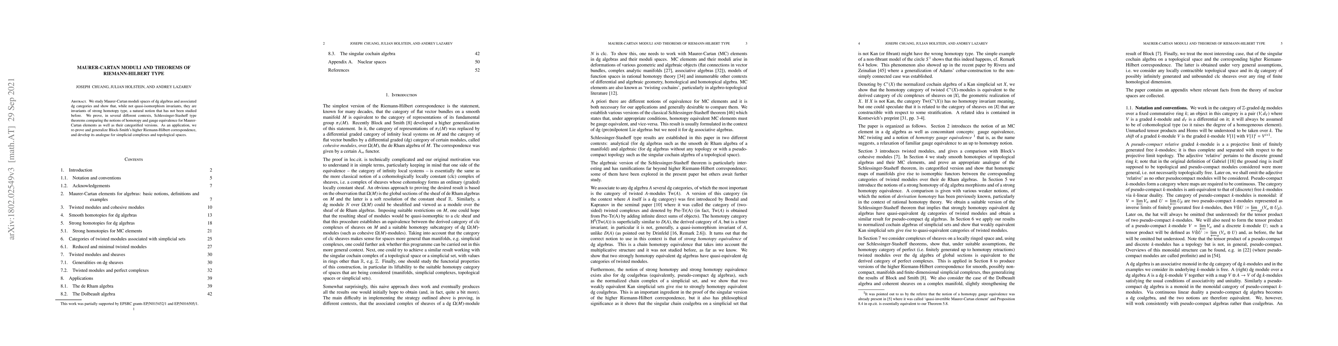 Summary: This paper investigates Maurer-Cartan moduli spaces within dg algebras, establishing them as invariants of strong homotopy type. It proves Schlessinger-Stasheff theorems for Maurer-Cartan elements and extends Block-Smith's higher Riemann-Hilbert correspondence for dg categories and topological spaces.