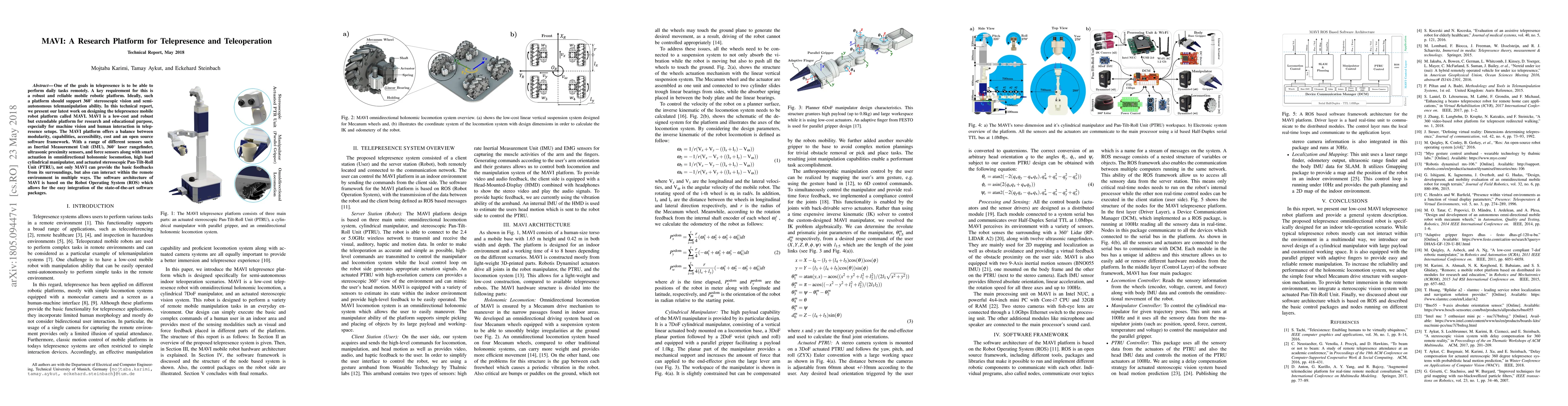 MAVI is a low-cost, robust telepresence mobile robot platform designed for research and education, featuring 360-degree stereoscopic vision and semi-autonomous telemanipulation capabilities, supported by an open-source software framework based on ROS. The platform includes a variety of sensors and smart actuation for versatile interaction in remote environments.