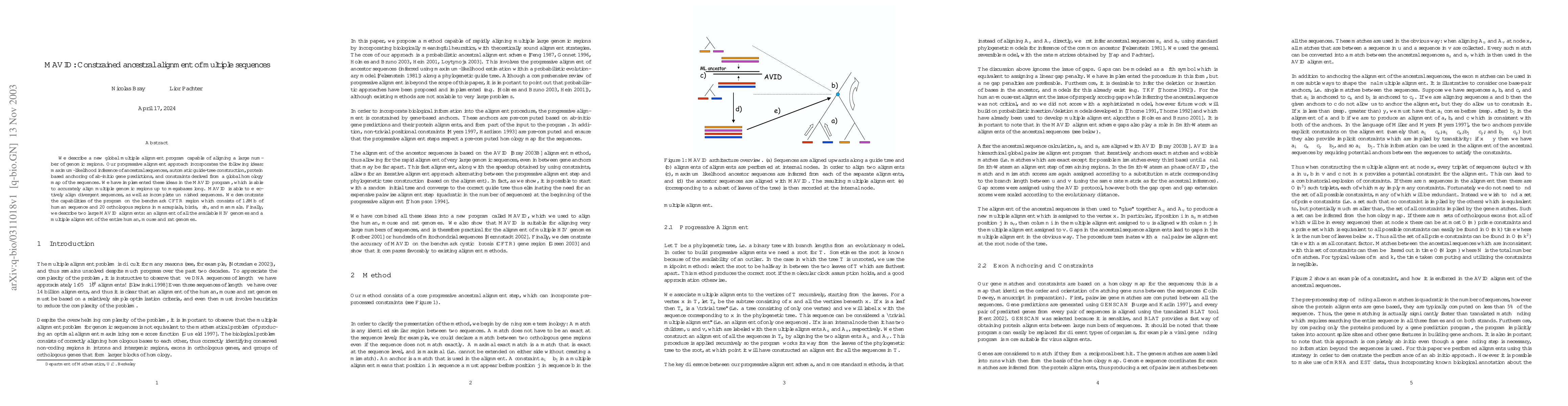 MAVID is a new global multiple alignment program designed to accurately align large genomic regions using maximum-likelihood inference, automatic guide-tree construction, and constraints from a global homology map. It demonstrates effectiveness on diverse sequences, including the CFTR region and large HIV and human-mouse-rat genome alignments.