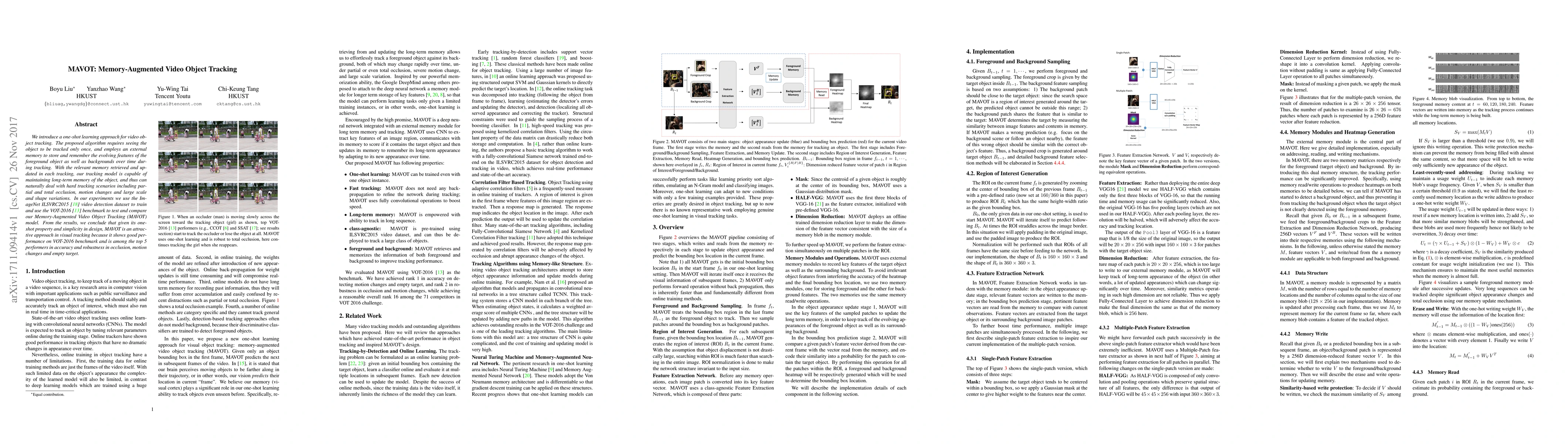 The MAVOT algorithm introduces a one-shot learning method for video object tracking that requires only a single observation of the target object. It utilizes an external memory to store evolving features, enabling it to handle complex tracking scenarios like occlusion and motion changes, and performs competitively on the VOT-2016 benchmark.