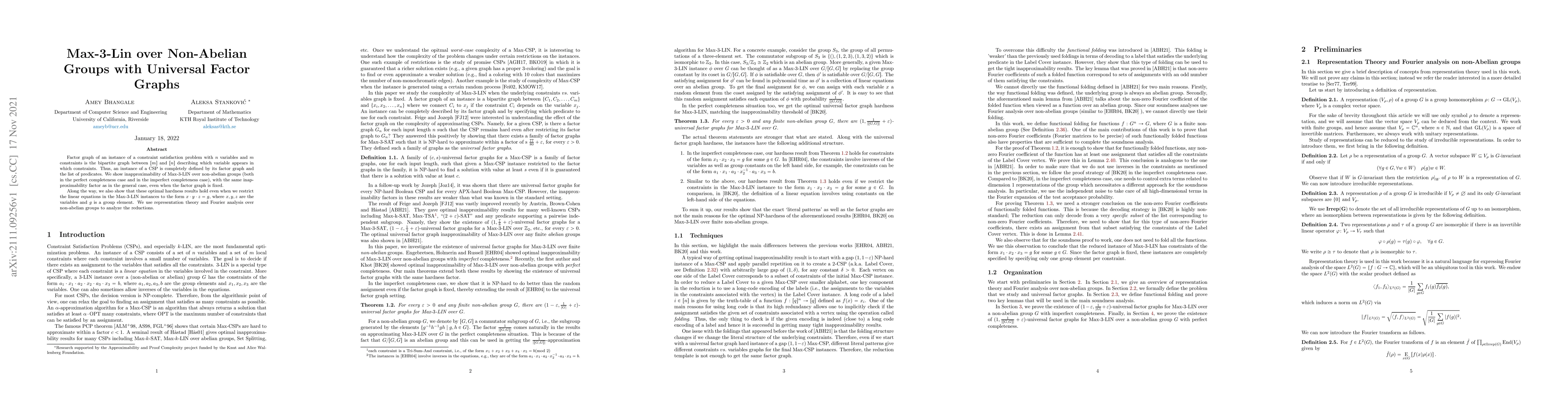 Factor graph of an instance of a constraint satisfaction problem with n variables and m constraints is the bipartite graph between [m] and [n] describing which variable appears in which constraints. Thus, an instance of a CSP is completely defined by its factor graph and the list of predicates. We show inapproximability of Max-3-LIN over non-abelian groups (both in the perfect completeness case and in the imperfect completeness case), with the same inapproximability factor as in the general case, even when the factor graph is fixed. Along the way, we also show that these optimal hardness results hold even when we restrict the linear equations in the Max-3-LIN instances to the form x * y * z = g, where x, y, z are the variables and g is a group element. We use representation theory and Fourier analysis over non-abelian groups to analyze the reductions.