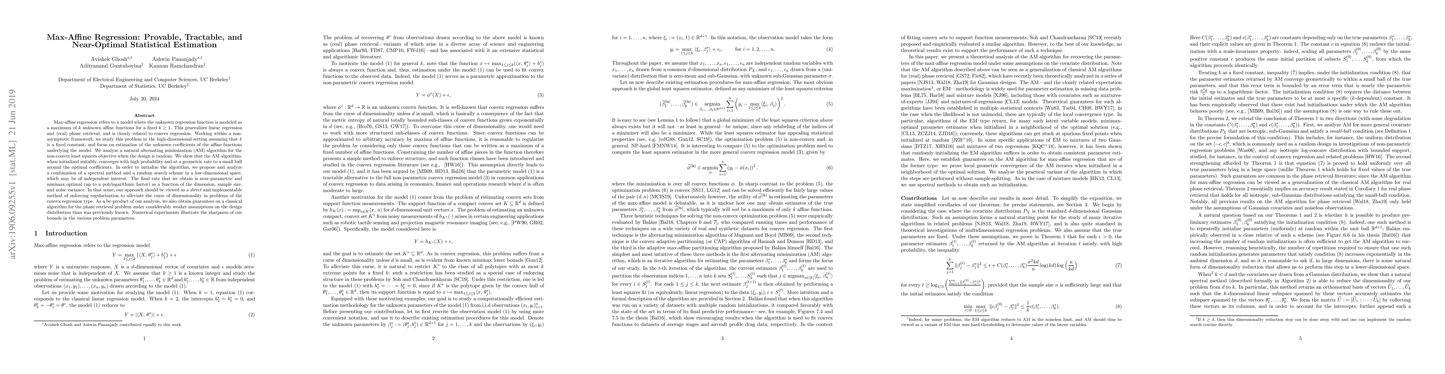 Max-affine regression models the unknown regression function as a maximum of $k$ affine functions. An alternating minimization algorithm is analyzed, showing it converges to near-optimal coefficients with high probability and a geometric rate, achieving near-parametric and minimax optimal rates in high dimensions.