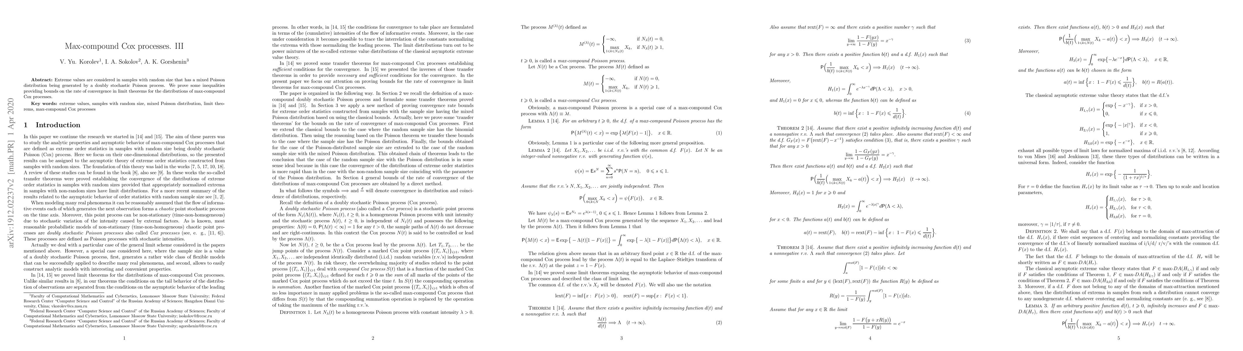 This paper investigates extreme values in samples with random size governed by a mixed Poisson distribution from a doubly stochastic Poisson process. It establishes inequalities that provide bounds on the rate of convergence in limit theorems for the distributions of max-compound Cox processes.