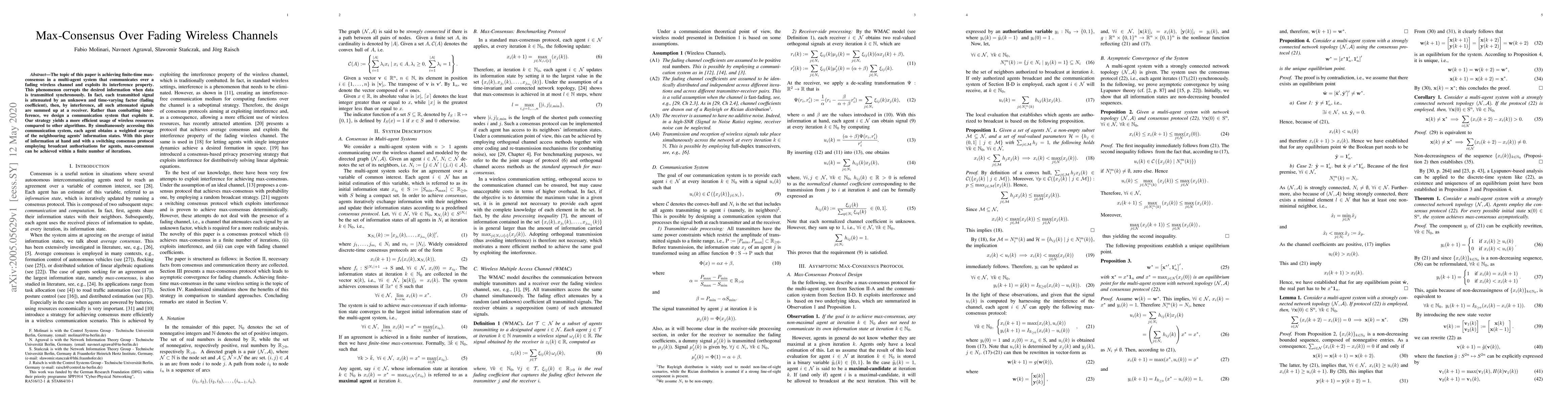 The topic of this paper is achieving finite-time max-consensus in a multi-agent system that communicates over a fading wireless channel and exploits its interference property. This phenomenon corrupts the desired information when data is transmitted synchronously. In fact, each transmitted signal is attenuated by an unknown and time-varying factor (fading coefficient), then, by interference, all such attenuated signals are summed up at a receiver. Rather than combatting interference, we design a communication system that exploits it. Our strategy yields a more efficient usage of wireless resources compared to other algorithms. By simultaneously accessing this communication system, each agent obtains a weighted average of the neighbouring agents' information states. With this piece of information at hand and with a switching consensus protocol employing broadcast authorisations for agents, max-consensus can be achieved within a finite number of iterations.