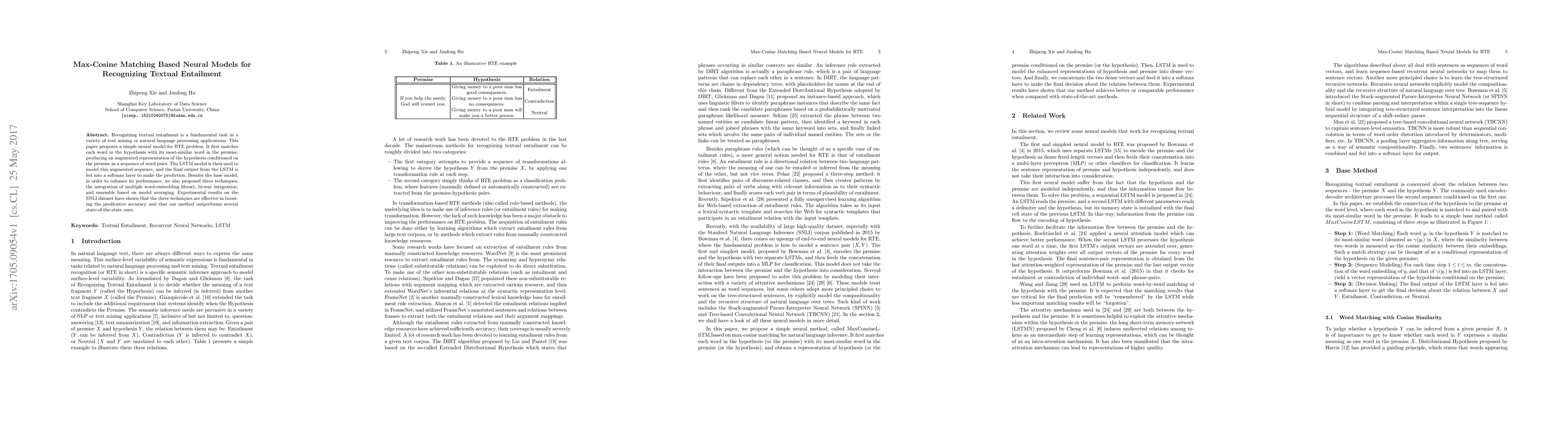 Recognizing textual entailment is a fundamental task in a variety of text mining or natural language processing applications. This paper proposes a simple neural model for RTE problem. It first matches each word in the hypothesis with its most-similar word in the premise, producing an augmented representation of the hypothesis conditioned on the premise as a sequence of word pairs. The LSTM model is then used to model this augmented sequence, and the final output from the LSTM is fed into a softmax layer to make the prediction. Besides the base model, in order to enhance its performance, we also proposed three techniques: the integration of multiple word-embedding library, bi-way integration, and ensemble based on model averaging. Experimental results on the SNLI dataset have shown that the three techniques are effective in boosting the predicative accuracy and that our method outperforms several state-of-the-state ones.