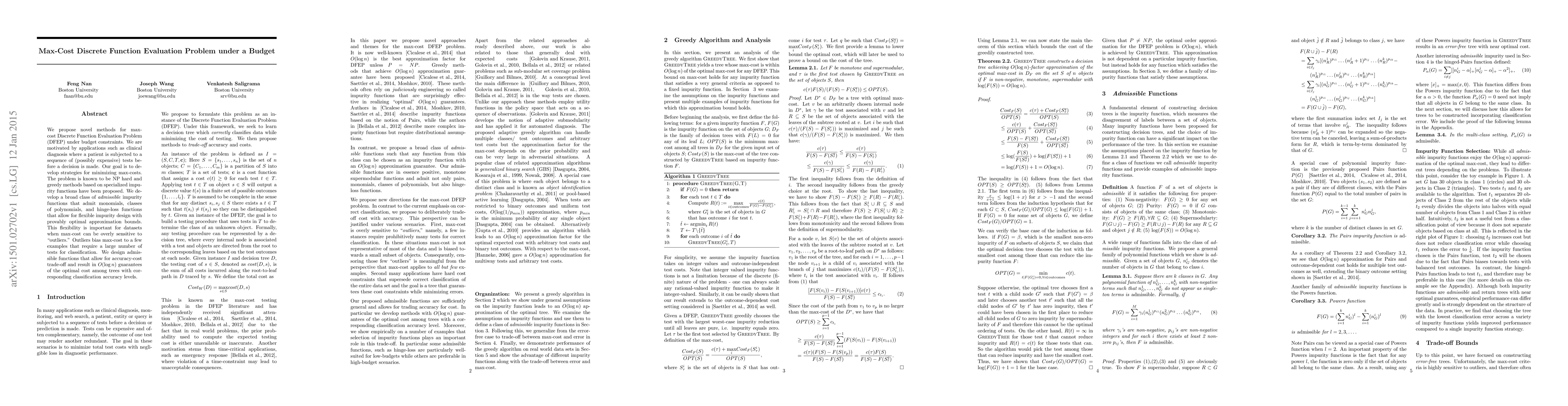 We propose novel methods for max-cost Discrete Function Evaluation Problem (DFEP) under budget constraints. We are motivated by applications such as clinical diagnosis where a patient is subjected to a sequence of (possibly expensive) tests before a decision is made. Our goal is to develop strategies for minimizing max-costs. The problem is known to be NP hard and greedy methods based on specialized impurity functions have been proposed. We develop a broad class of \emph{admissible} impurity functions that admit monomials, classes of polynomials, and hinge-loss functions that allow for flexible impurity design with provably optimal approximation bounds. This flexibility is important for datasets when max-cost can be overly sensitive to "outliers." Outliers bias max-cost to a few examples that require a large number of tests for classification. We design admissible functions that allow for accuracy-cost trade-off and result in $O(\log n)$ guarantees of the optimal cost among trees with corresponding classification accuracy levels.