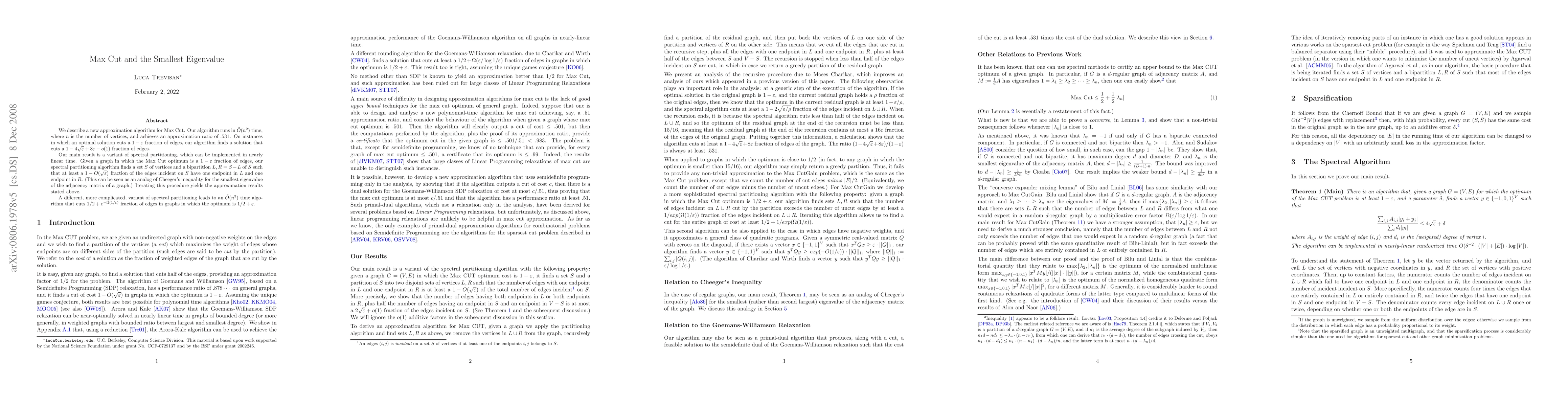 This paper presents a new approximation algorithm for the Max Cut problem, achieving an approximation ratio of 0.531 in $\tilde O(n^2)$ time. It utilizes a spectral partitioning method that iteratively finds bipartitions to approximate the optimal cut, analogous to Cheeger's inequality for the smallest eigenvalue of a graph's adjacency matrix.