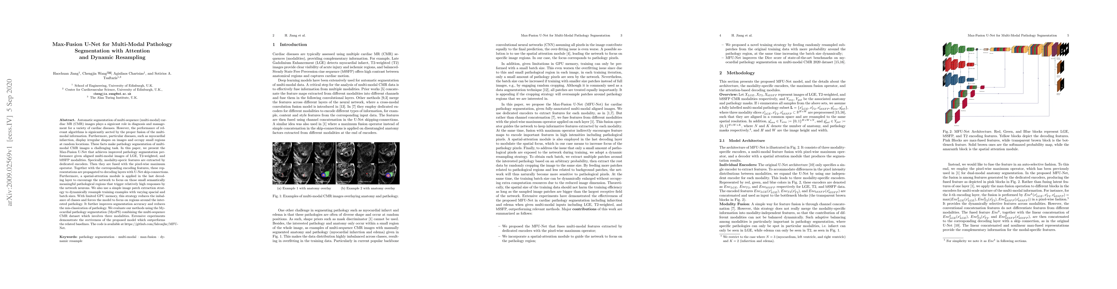 The Max-Fusion U-Net model enhances multi-modal cardiac MR image segmentation by fusing modality-specific features through a pixel-wise maximum operator and employing a spatial-attention module to focus on pathological regions. A dynamic resampling strategy further improves accuracy by balancing class distribution and highlighting relevant pathology.
