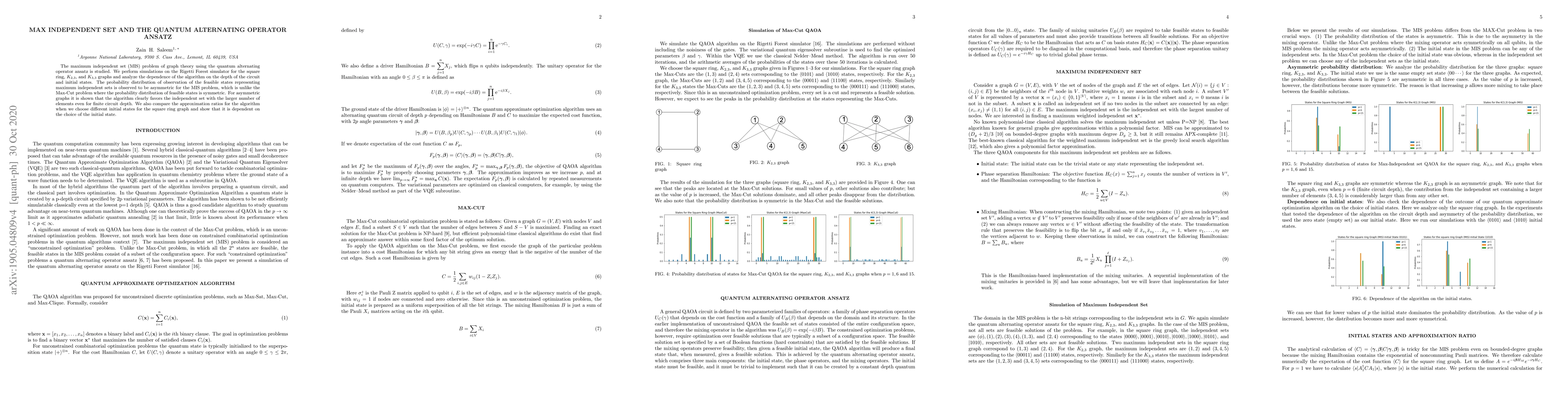 The maximum independent set (MIS) problem of graph theory using the quantum alternating operator ansatz is studied. We perform simulations on the Rigetti Forest simulator for the square ring, $K_{2,3}$, and $K_{3,3}$ graphs and analyze the dependence of the algorithm on the depth of the circuit and initial states. The probability distribution of observation of the feasible states representing maximum independent sets is observed to be asymmetric for the MIS problem, which is unlike the Max-Cut problem where the probability distribution of feasible states is symmetric. For asymmetric graphs it is shown that the algorithm clearly favors the independent set with the larger number of elements even for finite circuit depth. We also compare the approximation ratios for the algorithm when we choose different initial states for the square ring graph and show that it is dependent on the choice of the initial state.