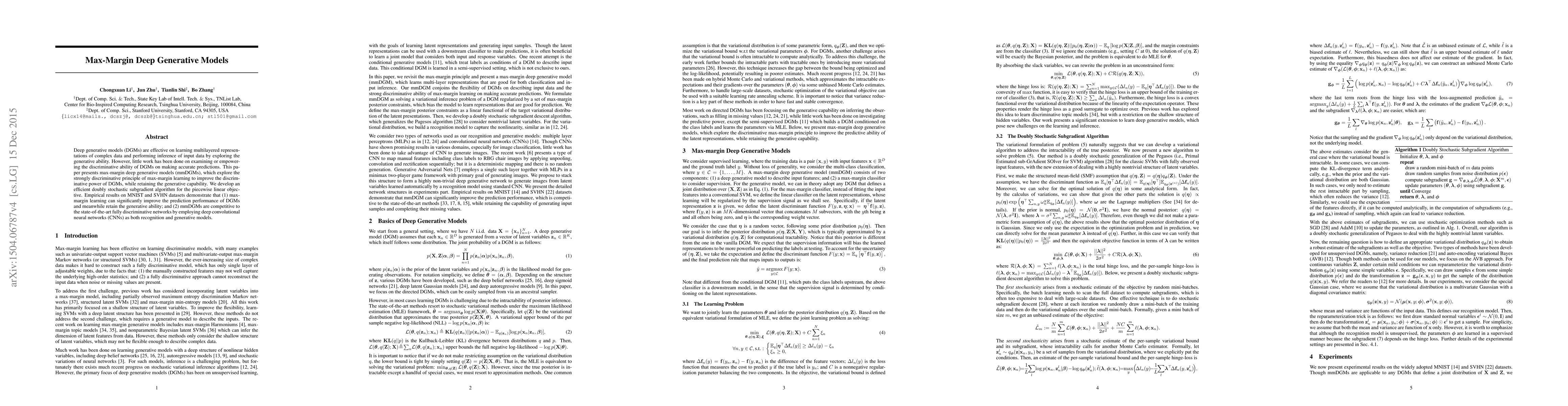 This paper introduces max-margin deep generative models (mmDGMs) that enhance the discriminative ability of deep generative models while preserving their generative capabilities. The proposed method significantly improves prediction performance on datasets like MNIST and SVHN, and competes with state-of-the-art fully discriminative networks.