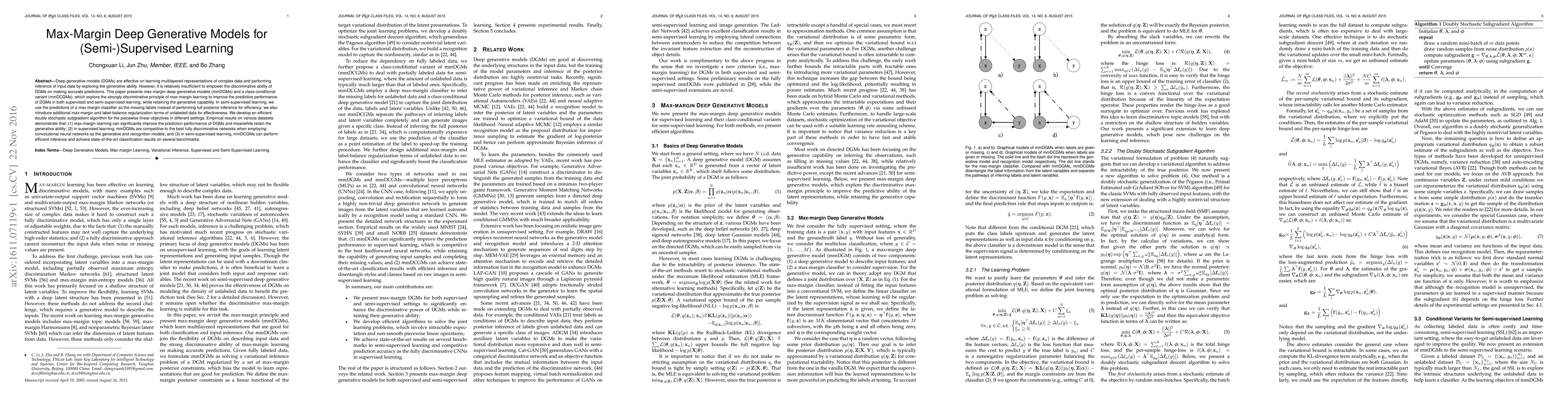 This paper introduces max-margin deep generative models (mmDGMs) to enhance the discriminative performance of deep generative models (DGMs) in supervised and semi-supervised learning while preserving their generative capabilities. It achieves this by integrating max-margin learning and employing a doubly stochastic subgradient algorithm, leading to significant improvements in predictive performance across various datasets.