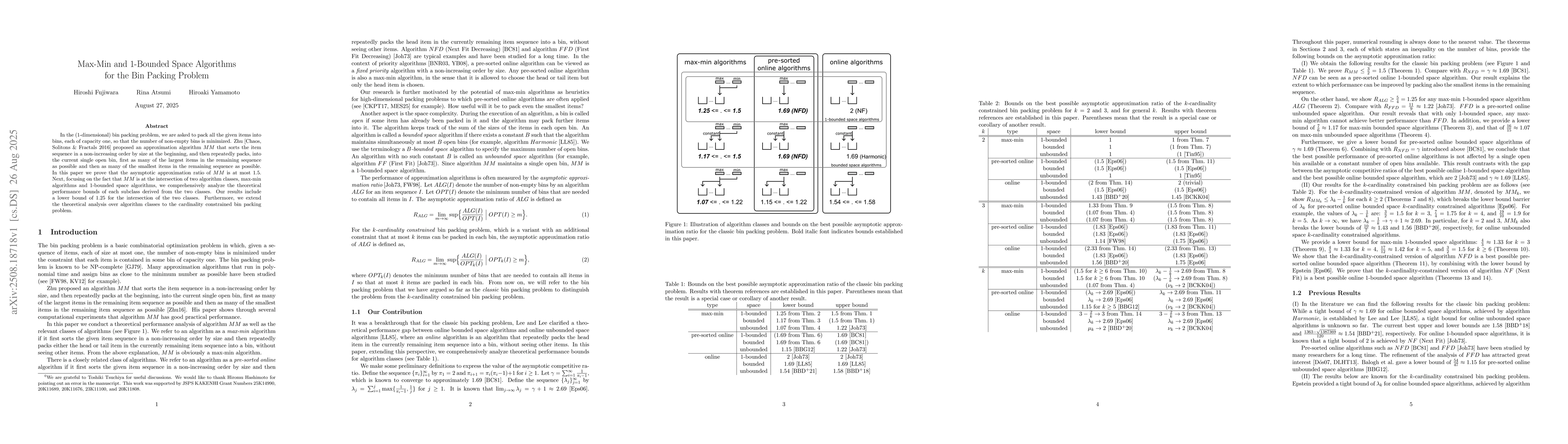In the (1-dimensional) bin packing problem, we are asked to pack all the given items into bins, each of capacity one, so that the number of non-empty bins is minimized. Zhu~[Chaos, Solitons \& Fractals 2016] proposed an approximation algorithm $MM$ that sorts the item sequence in a non-increasing order by size at the beginning, and then repeatedly packs, into the current single open bin, first as many of the largest items in the remaining sequence as possible and then as many of the smallest items in the remaining sequence as possible. In this paper we prove that the asymptotic approximation ratio of $MM$ is at most 1.5. Next, focusing on the fact that $MM$ is at the intersection of two algorithm classes, max-min algorithms and 1-bounded space algorithms, we comprehensively analyze the theoretical performance bounds of each subclass derived from the two classes. Our results include a lower bound of 1.25 for the intersection of the two classes. Furthermore, we extend the theoretical analysis over algorithm classes to the cardinality constrained bin packing problem.
